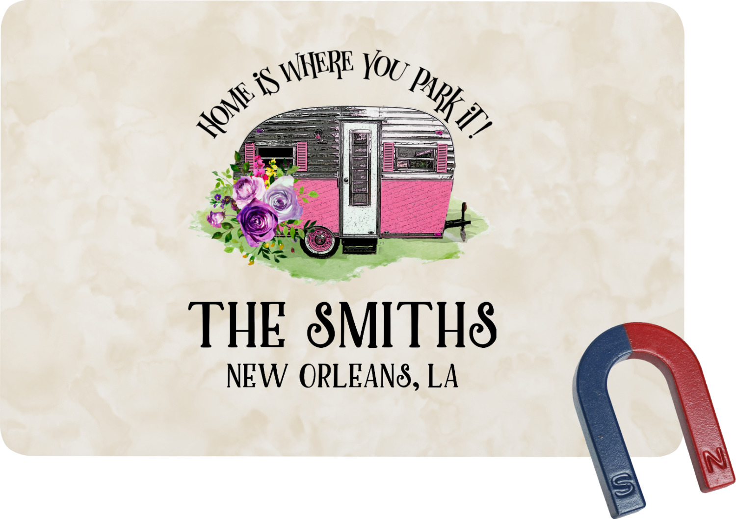 This fun design is absolutely stunning. The background is a subtle tan watercolor texture. The main graphic is an adorable pink trailer camper with sweet flowers all around it. The phrase going above it says "Home is where you park it!" You can easily personalize the text to say the place and date of a specific camping trip you always want to remember.
