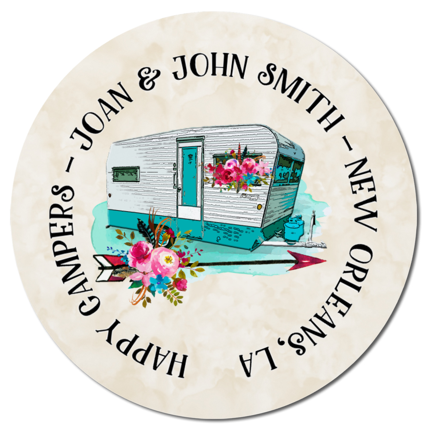This fun design is absolutely stunning. The background is a subtle tan watercolor texture. The main graphic is an adorable pink trailer camper with sweet flowers all around it. The phrase going above it says "Home is where you park it!" You can easily personalize the text to say the place and date of a specific camping trip you always want to remember.
