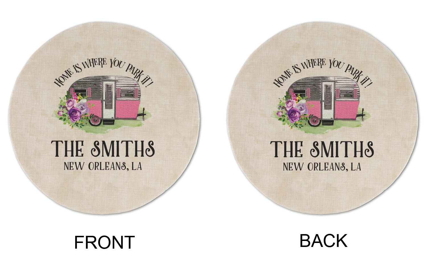 This fun design is absolutely stunning. The background is a subtle tan watercolor texture. The main graphic is an adorable pink trailer camper with sweet flowers all around it. The phrase going above it says "Home is where you park it!" You can easily personalize the text to say the place and date of a specific camping trip you always want to remember.