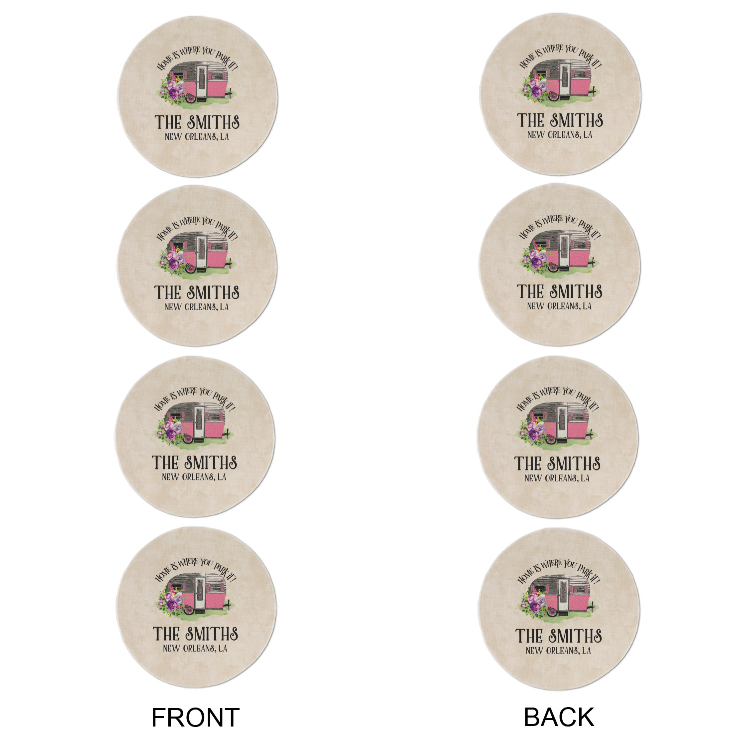 This fun design is absolutely stunning. The background is a subtle tan watercolor texture. The main graphic is an adorable pink trailer camper with sweet flowers all around it. The phrase going above it says "Home is where you park it!" You can easily personalize the text to say the place and date of a specific camping trip you always want to remember.