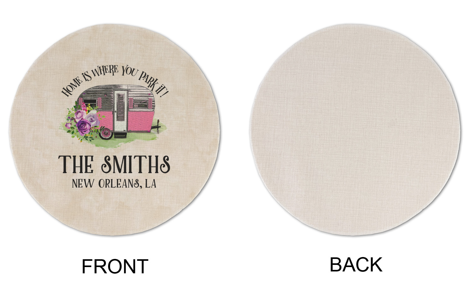 This fun design is absolutely stunning. The background is a subtle tan watercolor texture. The main graphic is an adorable pink trailer camper with sweet flowers all around it. The phrase going above it says "Home is where you park it!" You can easily personalize the text to say the place and date of a specific camping trip you always want to remember.
