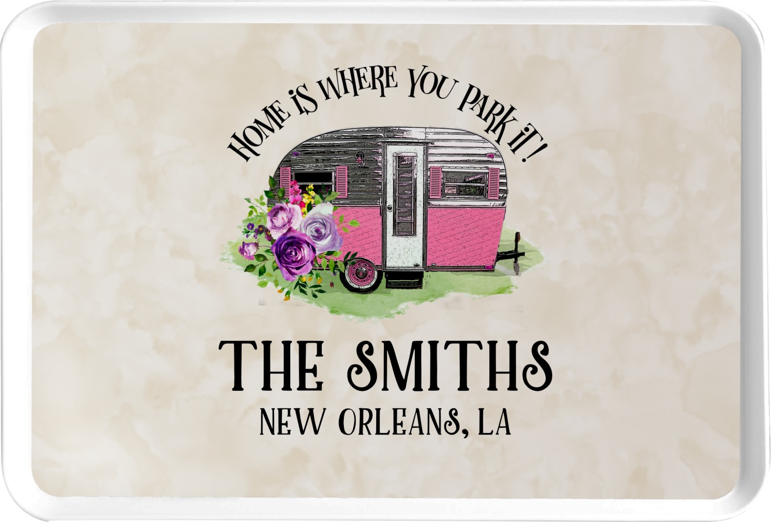 This fun design is absolutely stunning. The background is a subtle tan watercolor texture. The main graphic is an adorable pink trailer camper with sweet flowers all around it. The phrase going above it says "Home is where you park it!" You can easily personalize the text to say the place and date of a specific camping trip you always want to remember.