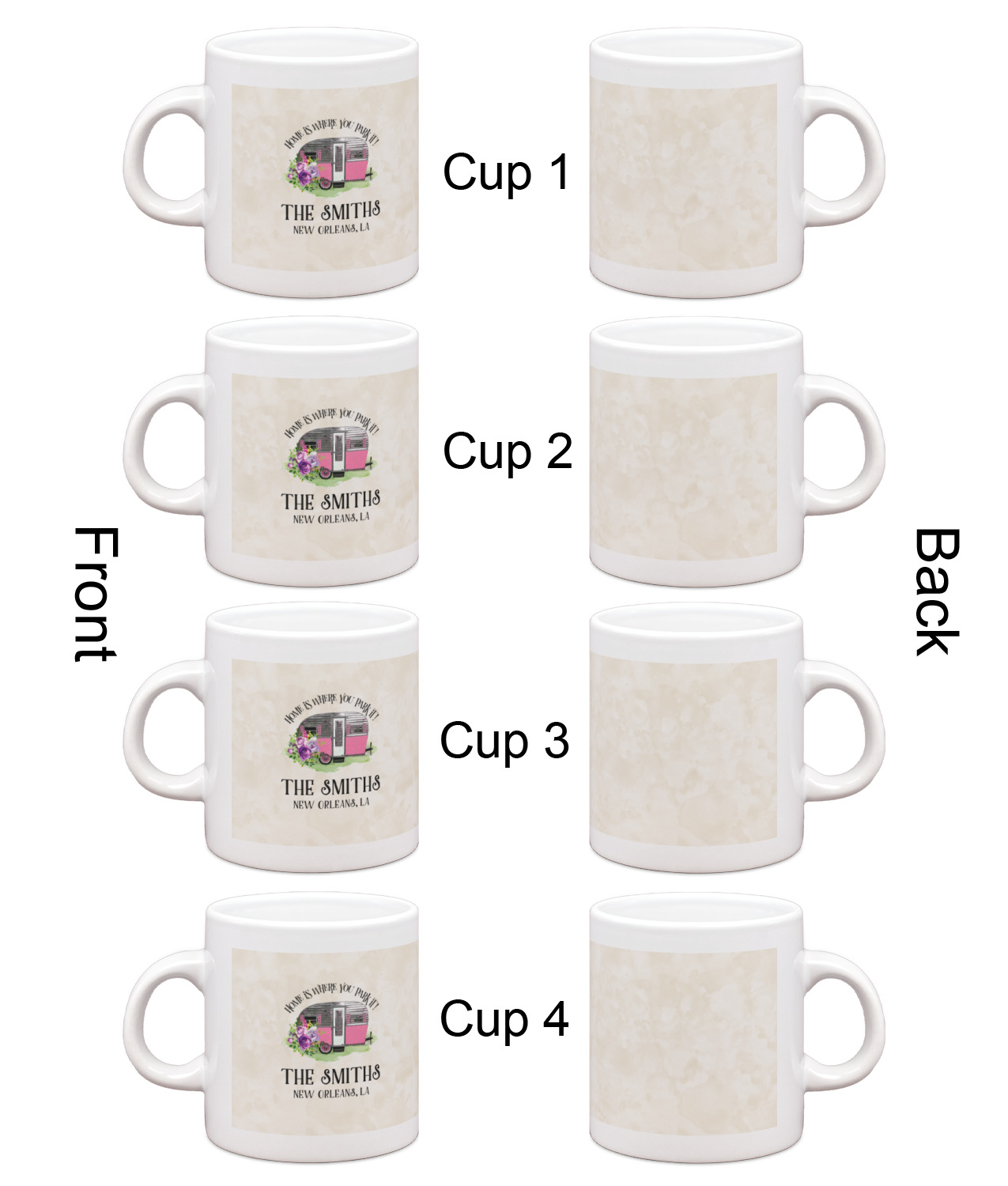 Each of our espresso mugs is a ceramic material sure to keep your drink warm. Personalize one cup for yourself, or order a set of 4! Its the perfect little gift for any coffee lover! We carry two sizes for you to personalize - 3 oz. (approx. 3.25" x 2.325" x 2.625") or 6 oz. (approx. 4" x 2.9" x 2.9"). Our 3 oz. mug is perfect for that single shot espresso while our 6 oz. mug can be your next favorite cappuccino cup holding two shots of espresso!