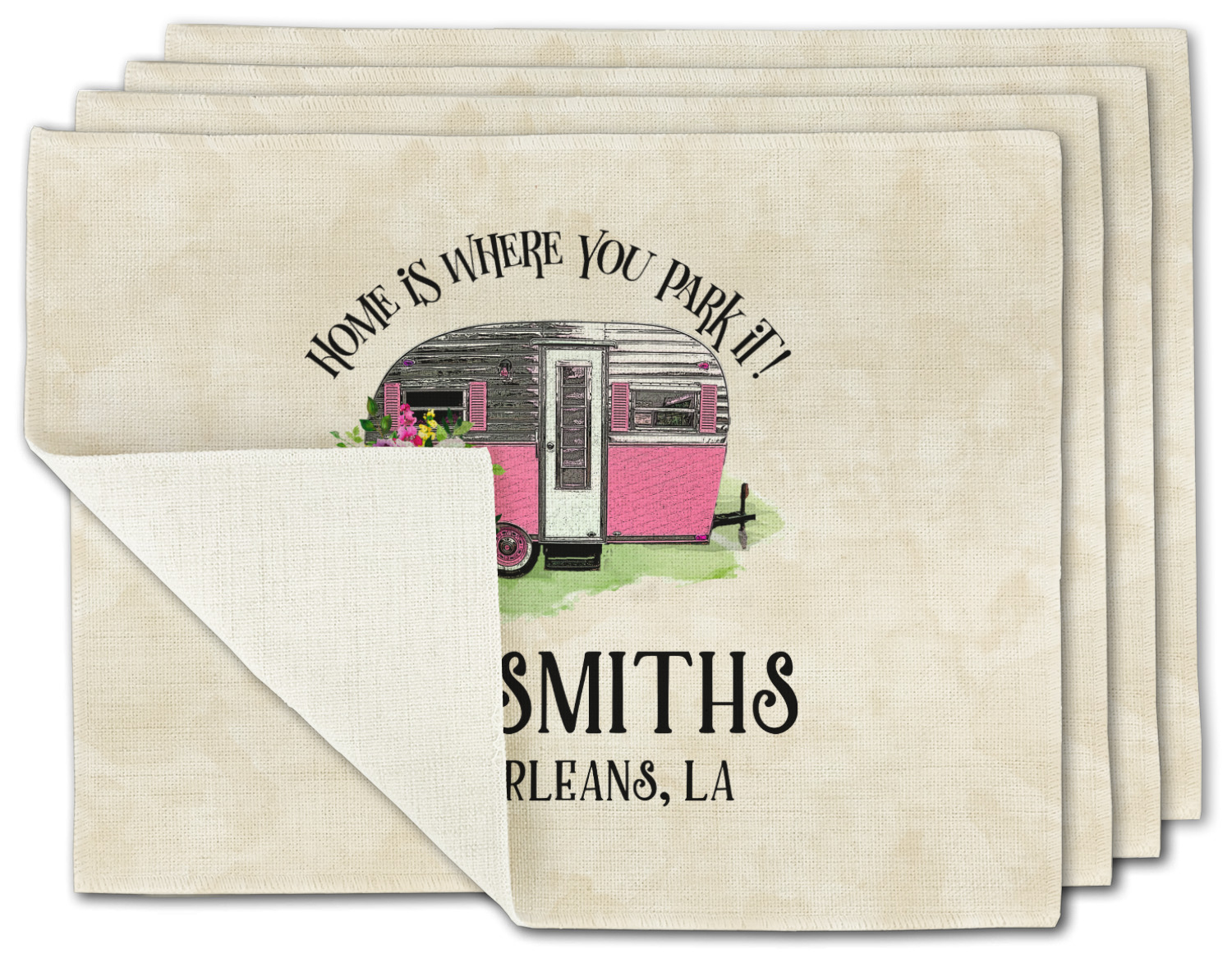 This fun design is absolutely stunning. The background is a subtle tan watercolor texture. The main graphic is an adorable pink trailer camper with sweet flowers all around it. The phrase going above it says "Home is where you park it!" You can easily personalize the text to say the place and date of a specific camping trip you always want to remember.