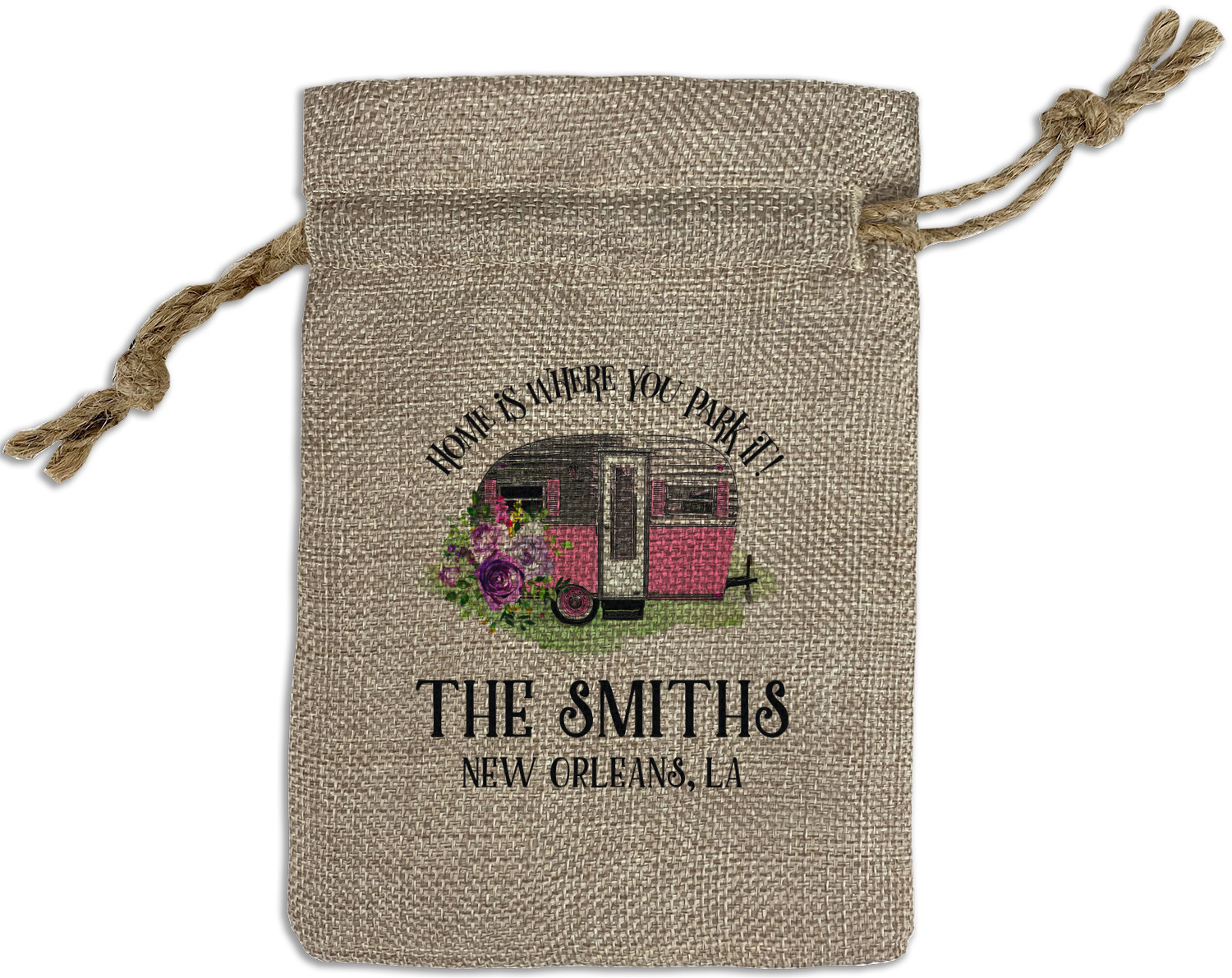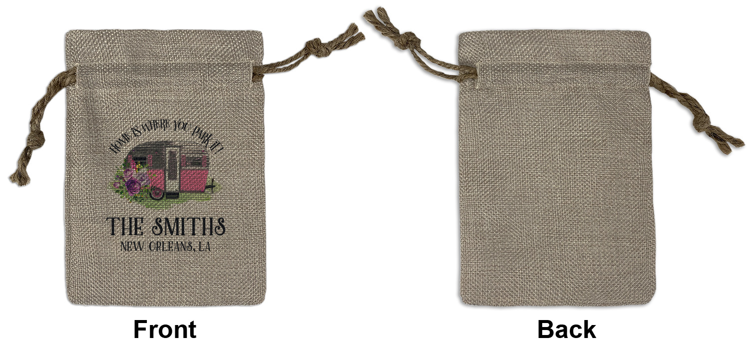 We sell our Burlap Gift Bags in 3 variant sized bags. Made with burlap polyester, each personalized bag can be secured with a twine drawstring pull. Your custom design is available to print on one side or both sides - completely up to you! The sizes of the bags measure approximately 4.5" x 6.5" for the smallest size, 6.5" x 8.0" for the medium size, and 6.5" x 13.5" for the large-sized bag.
