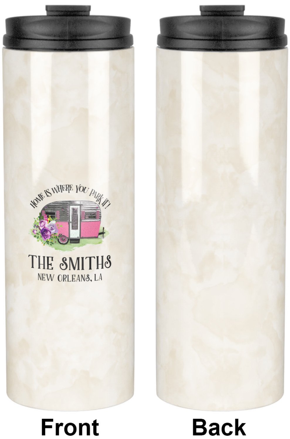 This fun design is absolutely stunning. The background is a subtle tan watercolor texture. The main graphic is an adorable pink trailer camper with sweet flowers all around it. The phrase going above it says "Home is where you park it!" You can easily personalize the text to say the place and date of a specific camping trip you always want to remember.