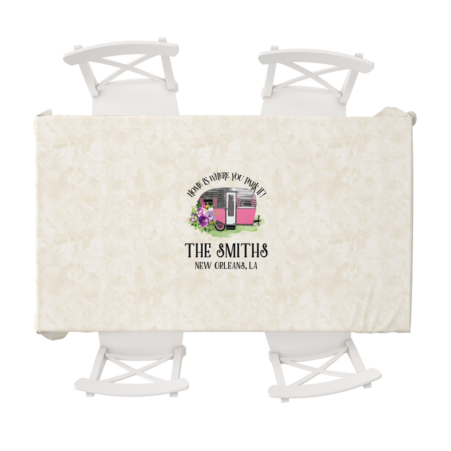 This fun design is absolutely stunning. The background is a subtle tan watercolor texture. The main graphic is an adorable pink trailer camper with sweet flowers all around it. The phrase going above it says "Home is where you park it!" You can easily personalize the text to say the place and date of a specific camping trip you always want to remember.