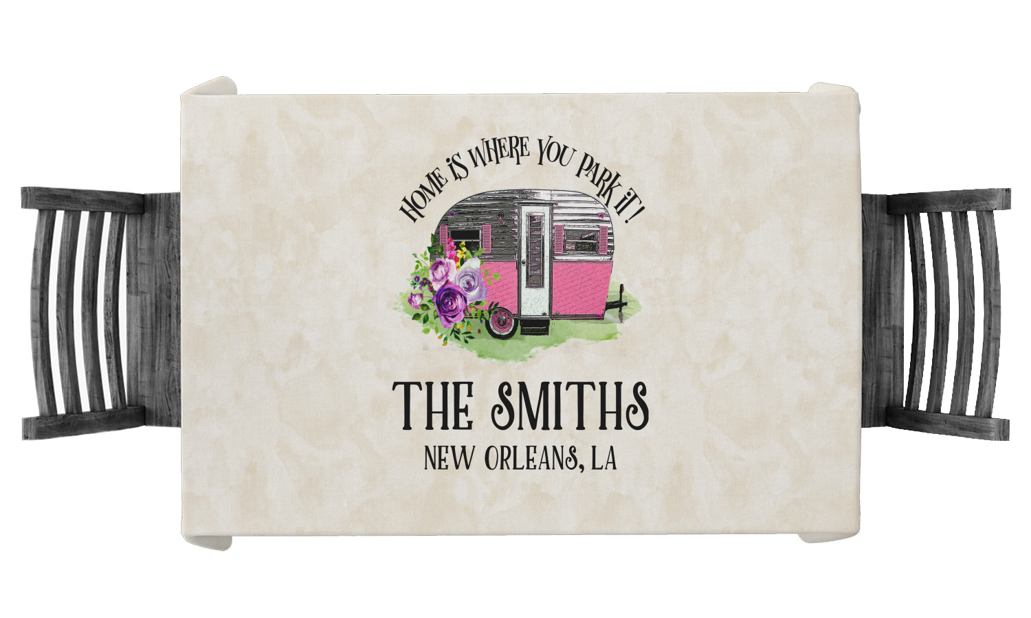 This fun design is absolutely stunning. The background is a subtle tan watercolor texture. The main graphic is an adorable pink trailer camper with sweet flowers all around it. The phrase going above it says "Home is where you park it!" You can easily personalize the text to say the place and date of a specific camping trip you always want to remember.