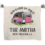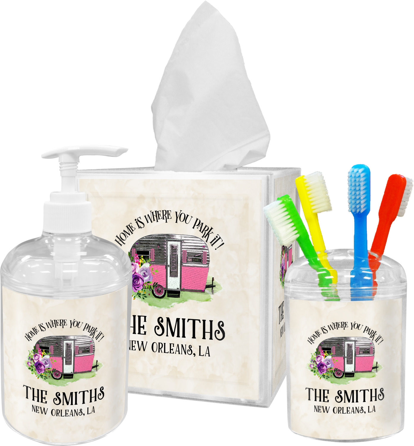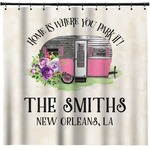 This fun design is absolutely stunning. The background is a subtle tan watercolor texture. The main graphic is an adorable pink trailer camper with sweet flowers all around it. The phrase going above it says "Home is where you park it!" You can easily personalize the text to say the place and date of a specific camping trip you always want to remember.