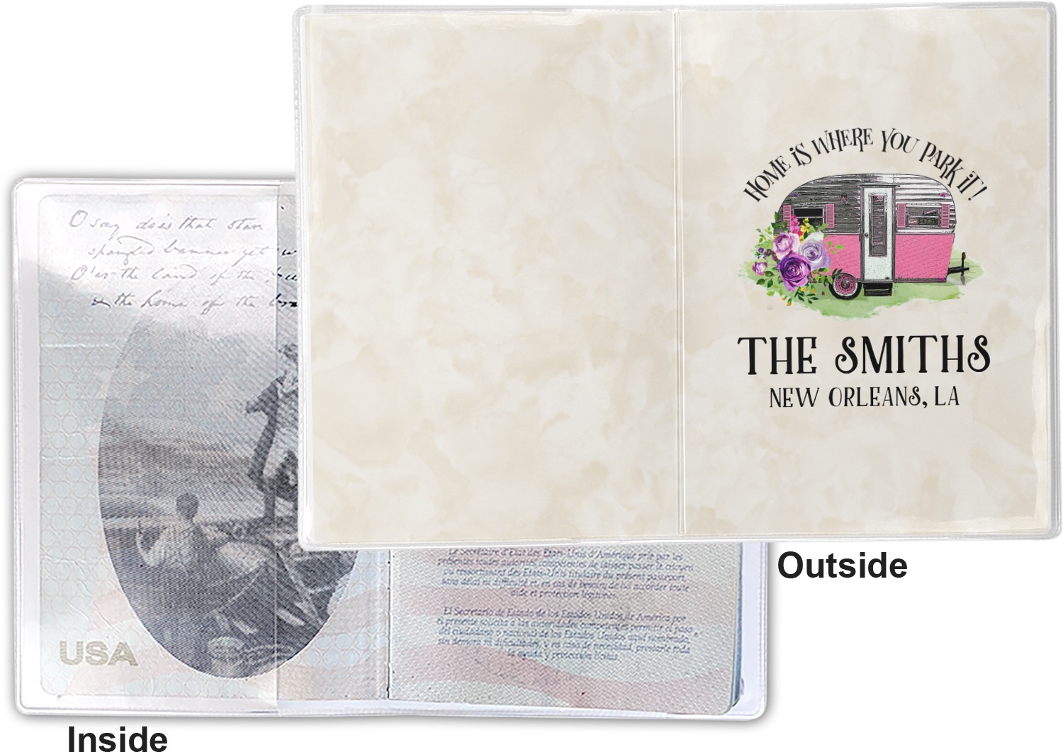 This cover is made of a sturdy clear vinyl with a personalized vinyl insert inside. There is a large and a small pocket on either side to hold the covers of your passport easily and firmly. The passport holder is approximately 7.5" x 5.25", the perfect size to snugly fit your passport. This slim cover is the perfect way to protect your passport without being one more bulky item you have to carry.