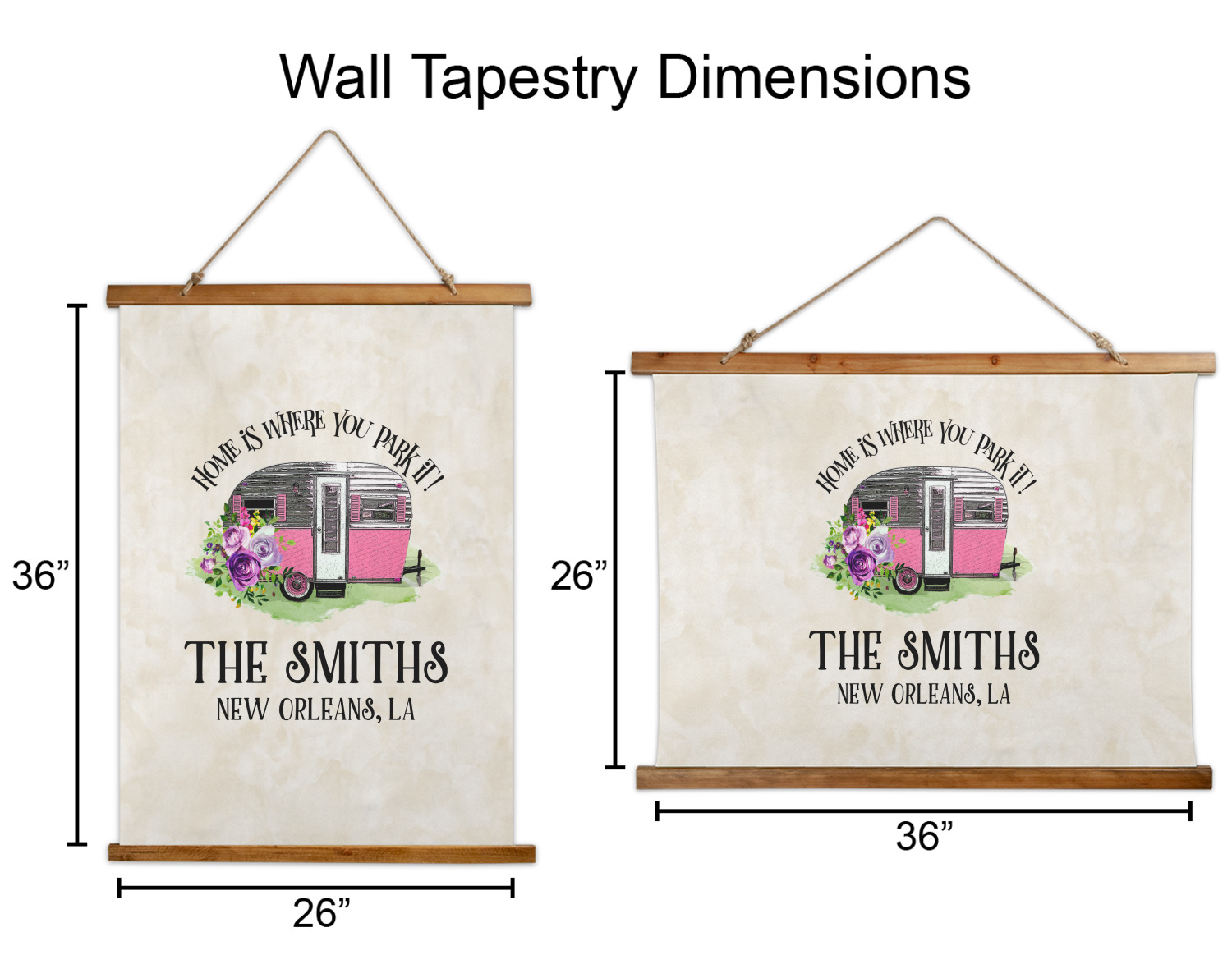 Made in two different orientations - portrait or landscape - both are 26" x 36". Your design is printed on a high quality polyester fabric with hemmed edges. The wood on the top and bottom of the tapestry is 1.25" tall and 0.25" thick and there are two pieces on top and bottom which sandwich the fabric.