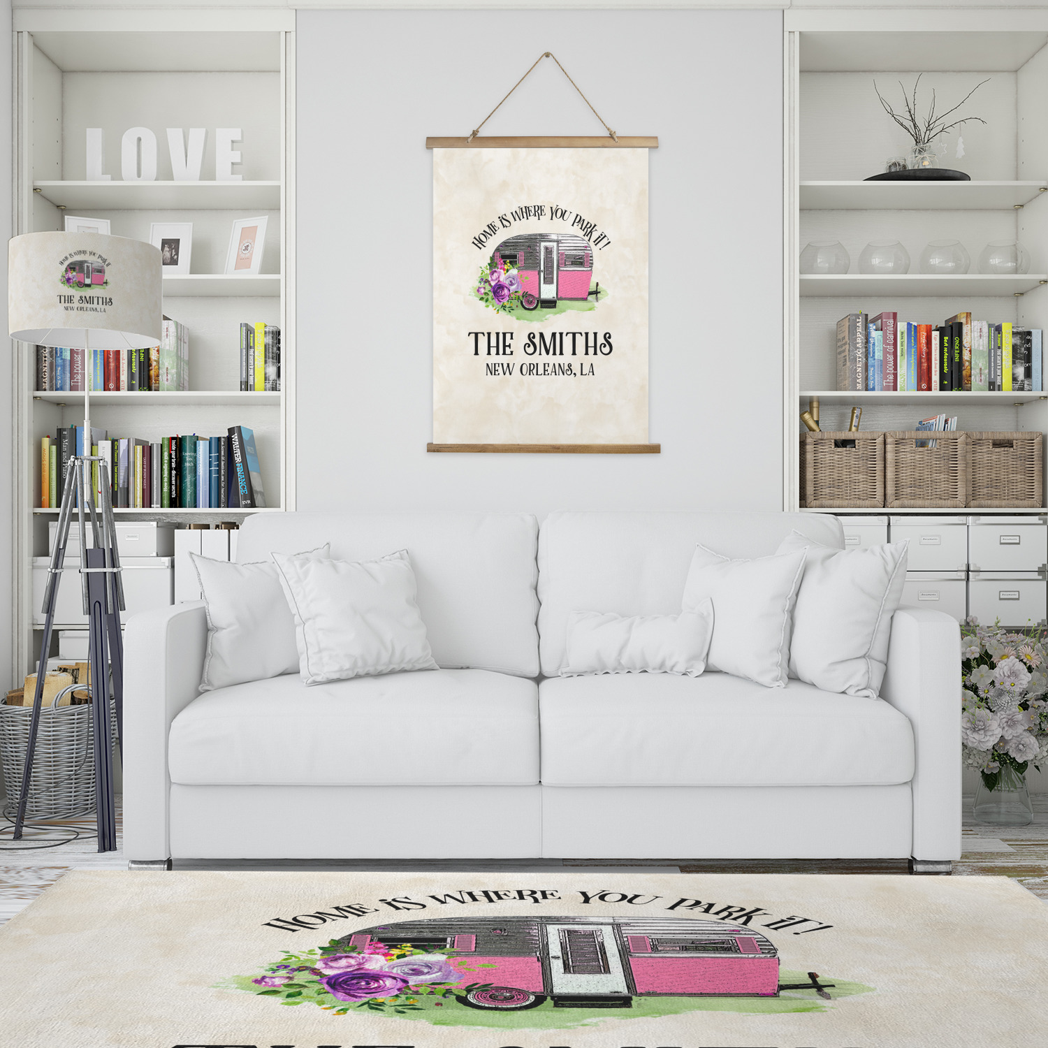 This fun design is absolutely stunning. The background is a subtle tan watercolor texture. The main graphic is an adorable pink trailer camper with sweet flowers all around it. The phrase going above it says "Home is where you park it!" You can easily personalize the text to say the place and date of a specific camping trip you always want to remember.