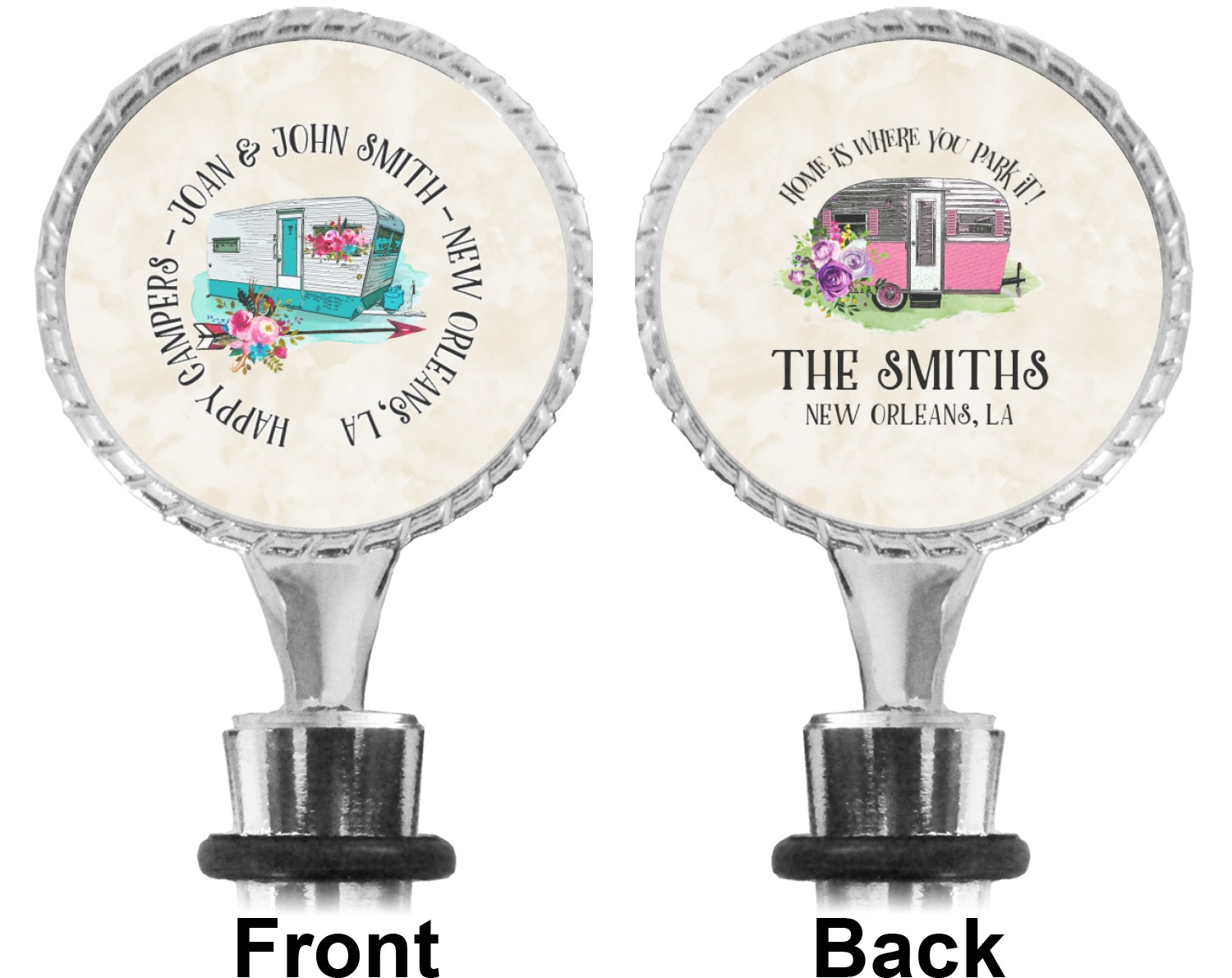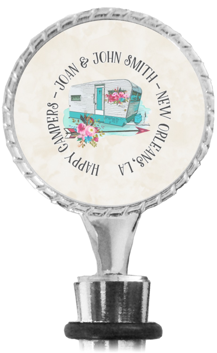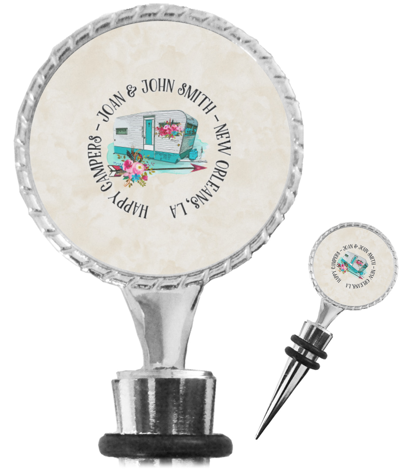 The top part of your bottle stopper is comprised of a zinc ring that displays your customization(s) in its middle, on both sides. The ring is heavy duty, with a bright chrome finish. The body of the wine stoppers have two silicone rings to provide an airtight seal. These wine bottle stoppers measure at 1.625" L x 0.8125" W x 4.625" H; your custom wine stopper is meant to fit into most standard-sized wine bottles.