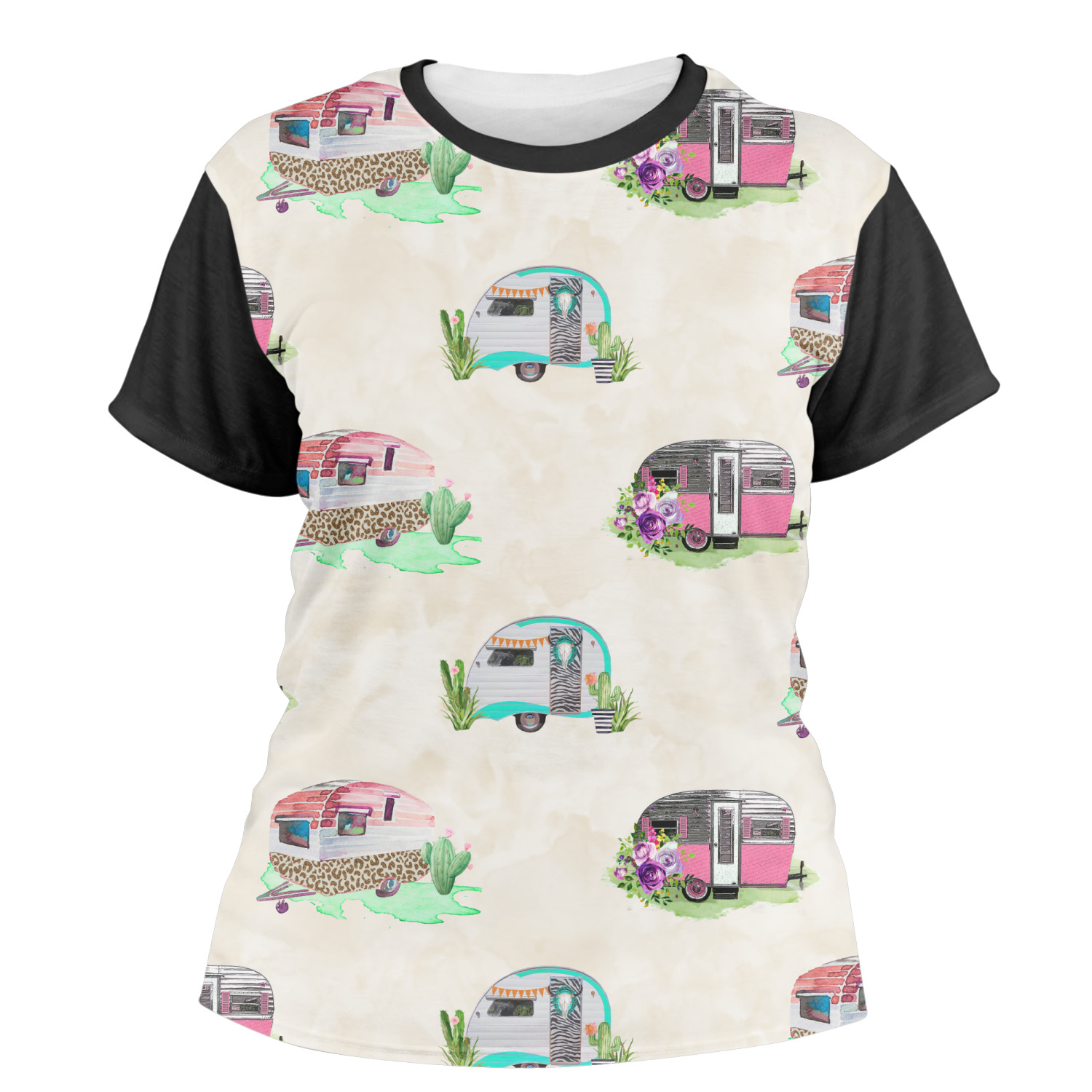 Our womens t-shirts are a lovely jersey knit polyester. They come in 6 different sizes ranging from X-Small to XX-Large. These shirts are your basic comfy crew neck t-shirts that look good on anyone. You are able to personalize the sleeves, front, AND back! Isn't that awesome?! Make everything one color or all different. The choice is yours.