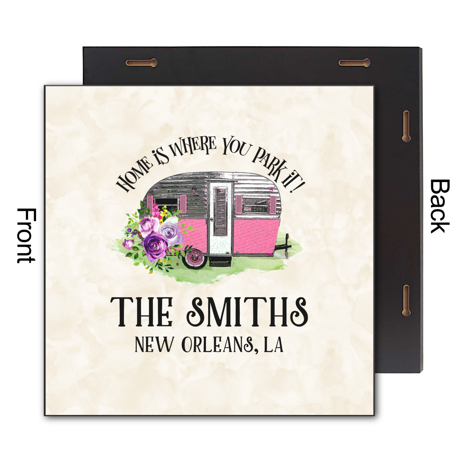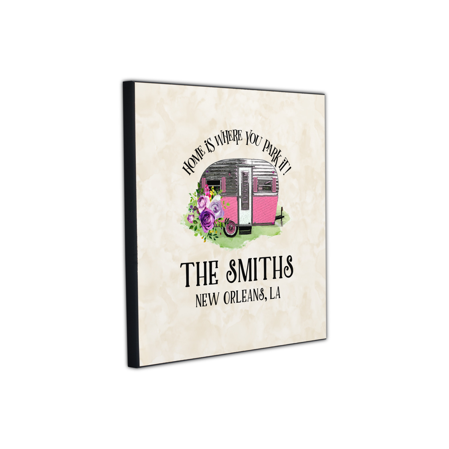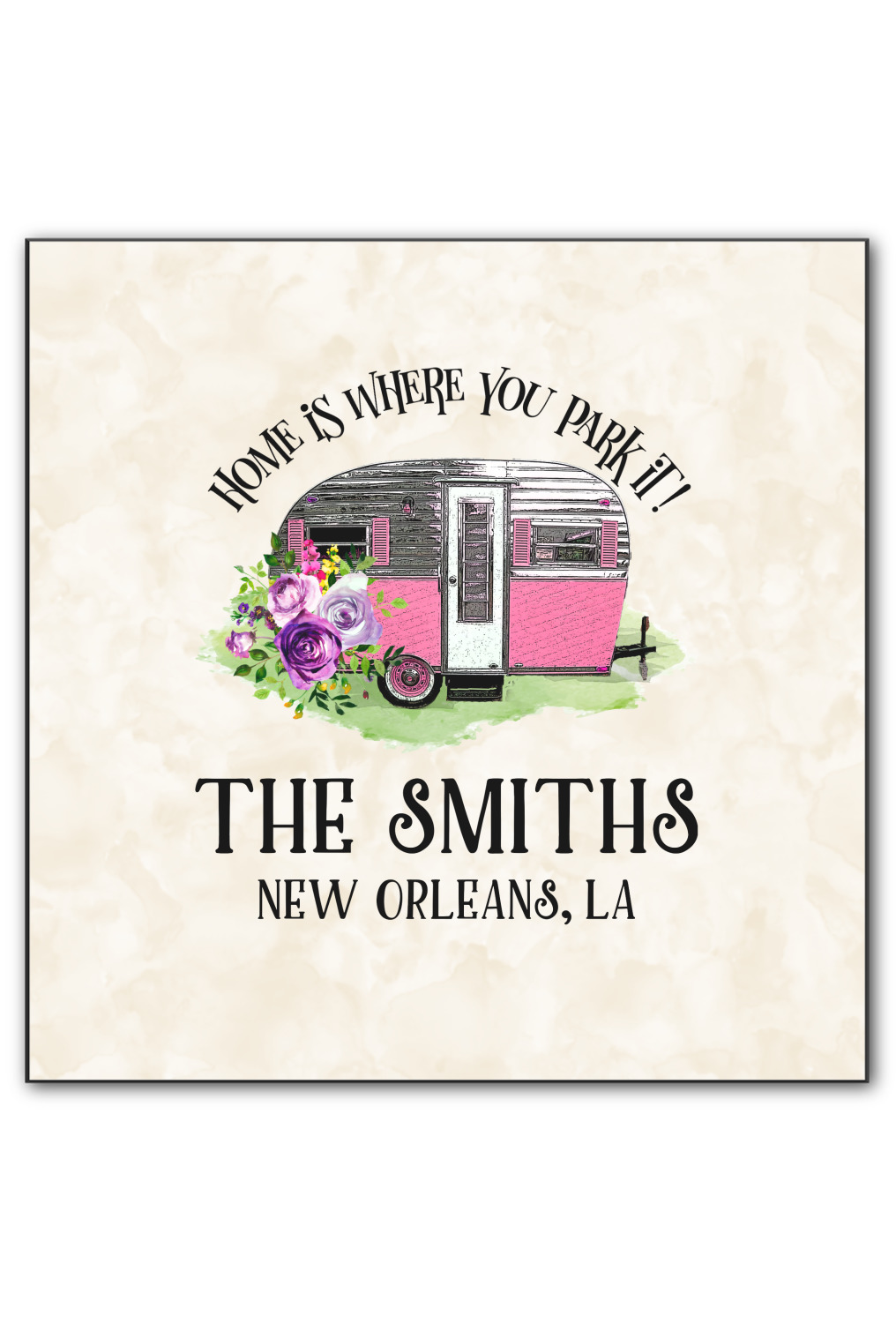 This fun design is absolutely stunning. The background is a subtle tan watercolor texture. The main graphic is an adorable pink trailer camper with sweet flowers all around it. The phrase going above it says "Home is where you park it!" You can easily personalize the text to say the place and date of a specific camping trip you always want to remember.