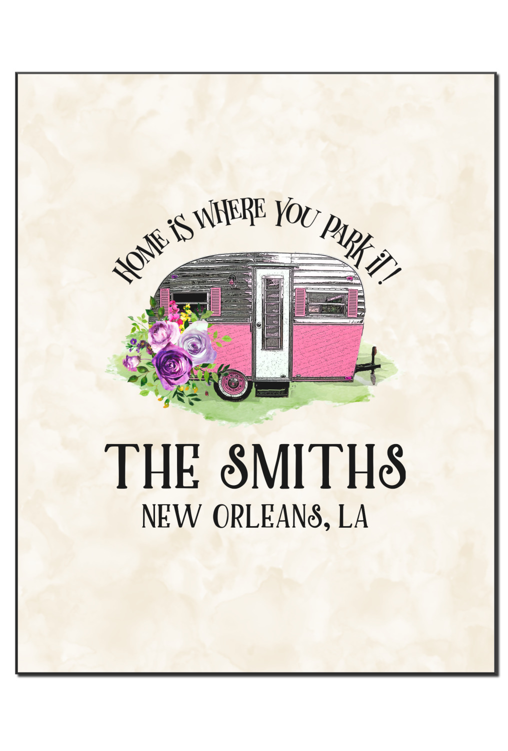 This fun design is absolutely stunning. The background is a subtle tan watercolor texture. The main graphic is an adorable pink trailer camper with sweet flowers all around it. The phrase going above it says "Home is where you park it!" You can easily personalize the text to say the place and date of a specific camping trip you always want to remember.