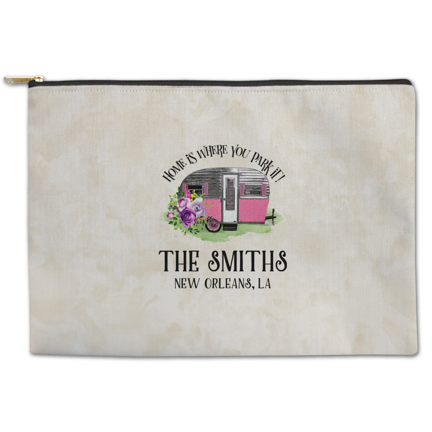 Our zippered pouches are available in two sizes - small: approx 8.5W"x6H and large: approx 12.5Wx8.5H. The pouches are made from a soft & durable canvas fabric that is printed on the outside with your design; the inside has a fused black lining. The printed canvas fabric is then cut and the pouches are sewn right here in the USA. The zipper itself is gold in color and has a round hook.