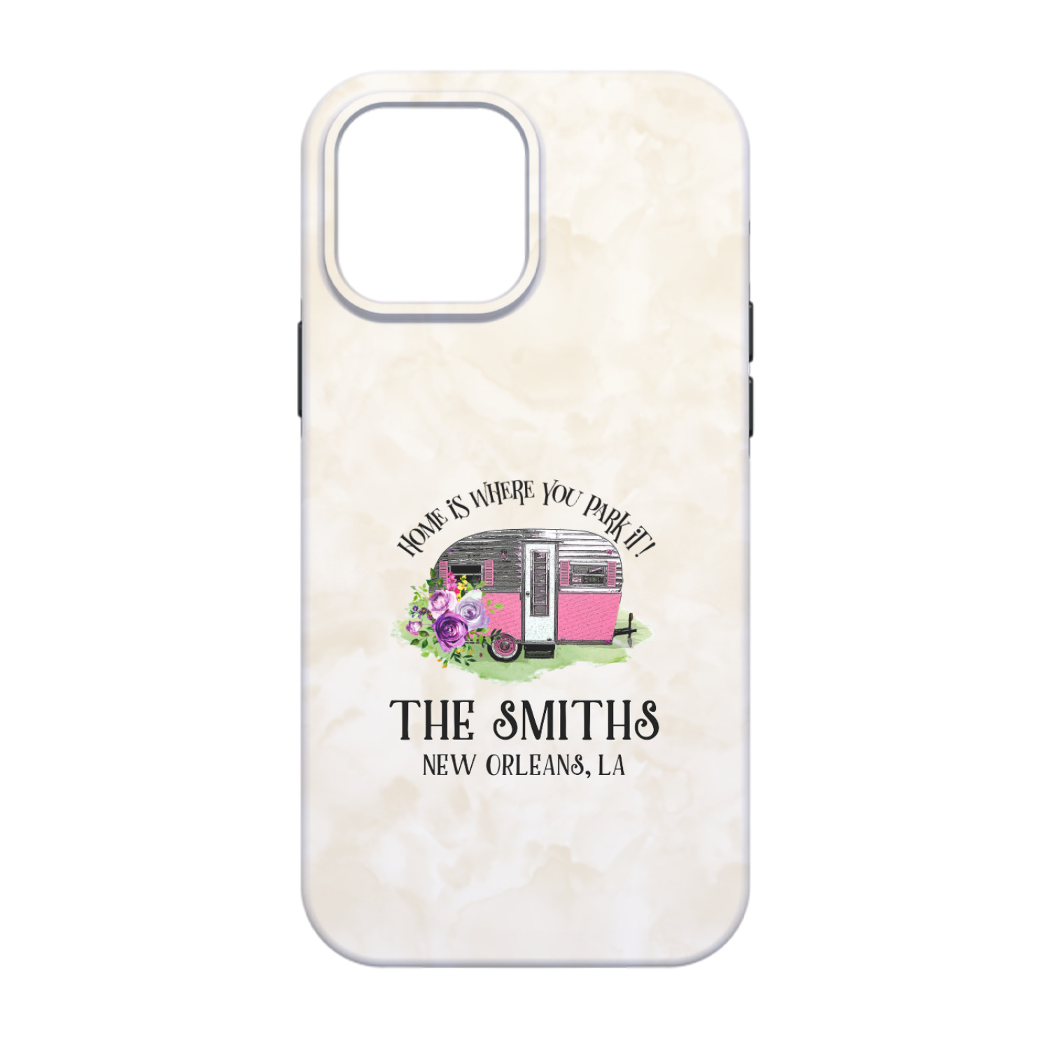 This fun design is absolutely stunning. The background is a subtle tan watercolor texture. The main graphic is an adorable pink trailer camper with sweet flowers all around it. The phrase going above it says "Home is where you park it!" You can easily personalize the text to say the place and date of a specific camping trip you always want to remember.