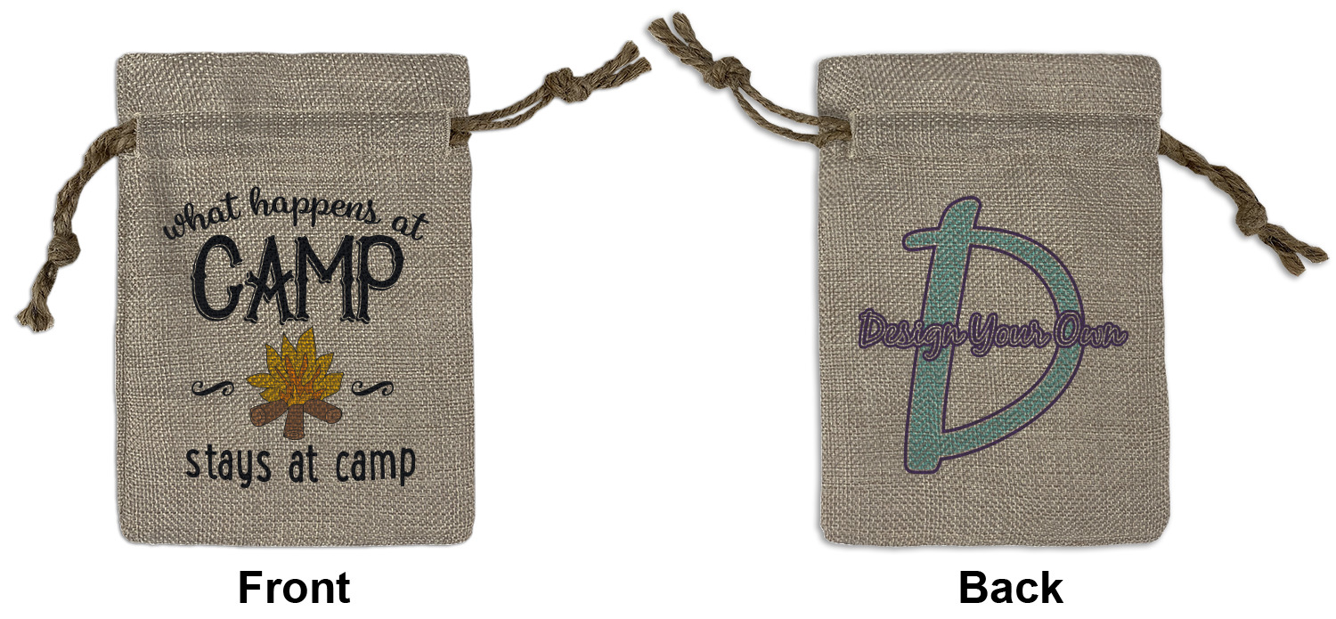 We sell our Burlap Gift Bags in 3 variant sized bags. Made with burlap polyester, each personalized bag can be secured with a twine drawstring pull. Your custom design is available to print on one side or both sides - completely up to you! The sizes of the bags measure approximately 4.5" x 6.5" for the smallest size, 6.5" x 8.0" for the medium size, and 6.5" x 13.5" for the large-sized bag.