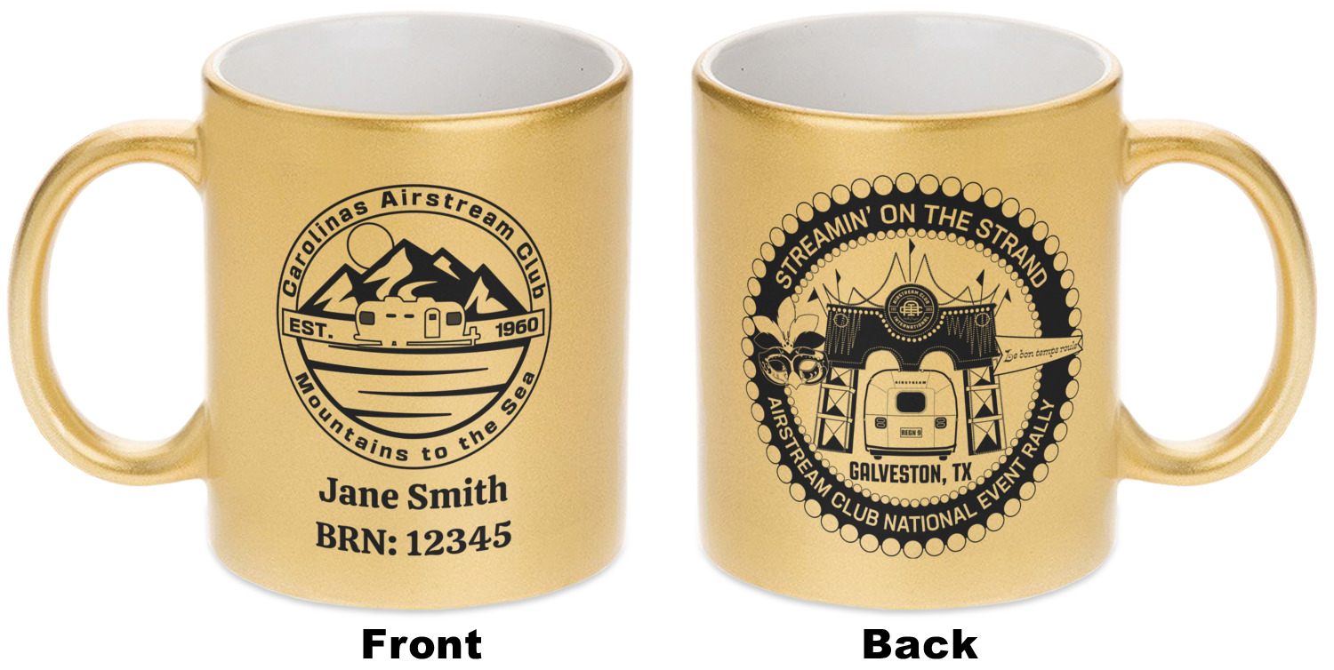 Our custom mugs are ceramic, which is great for keeping your tea or coffee warm! We offer two metallic mugs to personalize - Silver or Gold. Both styles hold around 11oz and have dimensions of approximately 3.75" x 3.5" x 4.75". Both the metallic mugs come in a matte finish and have glitter detailing to add a more pristine feel to the gold and silver base colors.