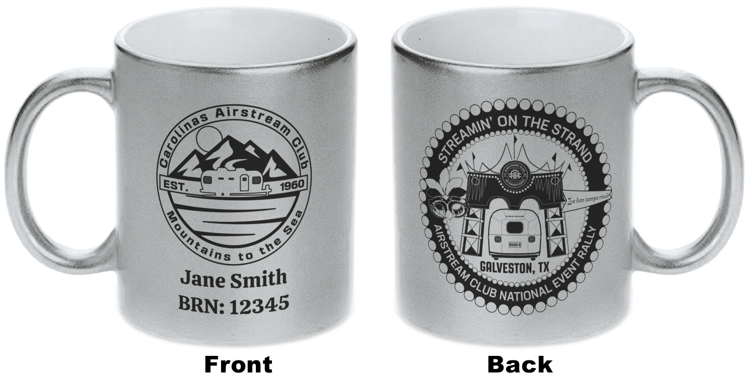 Our custom mugs are ceramic, which is great for keeping your tea or coffee warm! We offer two metallic mugs to personalize - Silver or Gold. Both styles hold around 11oz and have dimensions of approximately 3.75" x 3.5" x 4.75". Both the metallic mugs come in a matte finish and have glitter detailing to add a more pristine feel to the gold and silver base colors.