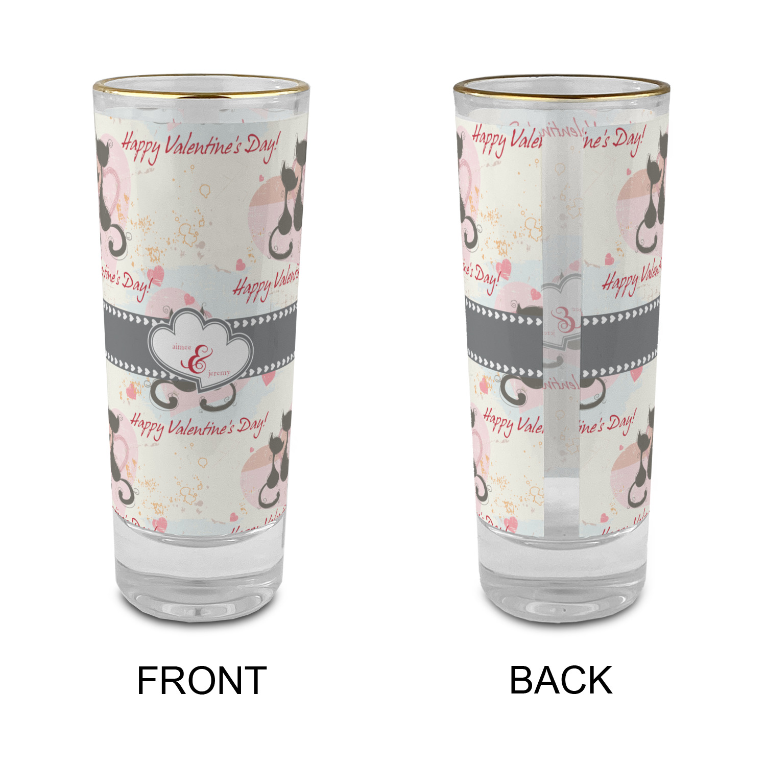 These glass shooter glasses are printed in full color with the design of your choice. These are a tall shooter 2 oz size and stand 4" tall. The print is a full wrap design to boldly display your personalization.