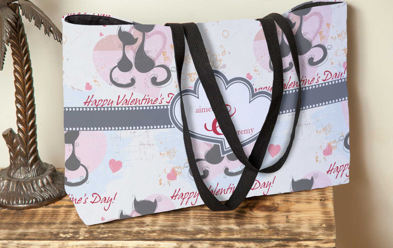 These beach totes are handmade here in the USA. Fabric is printed with your design. The tote is then sewn from the fabric pieces, lining and handles added.