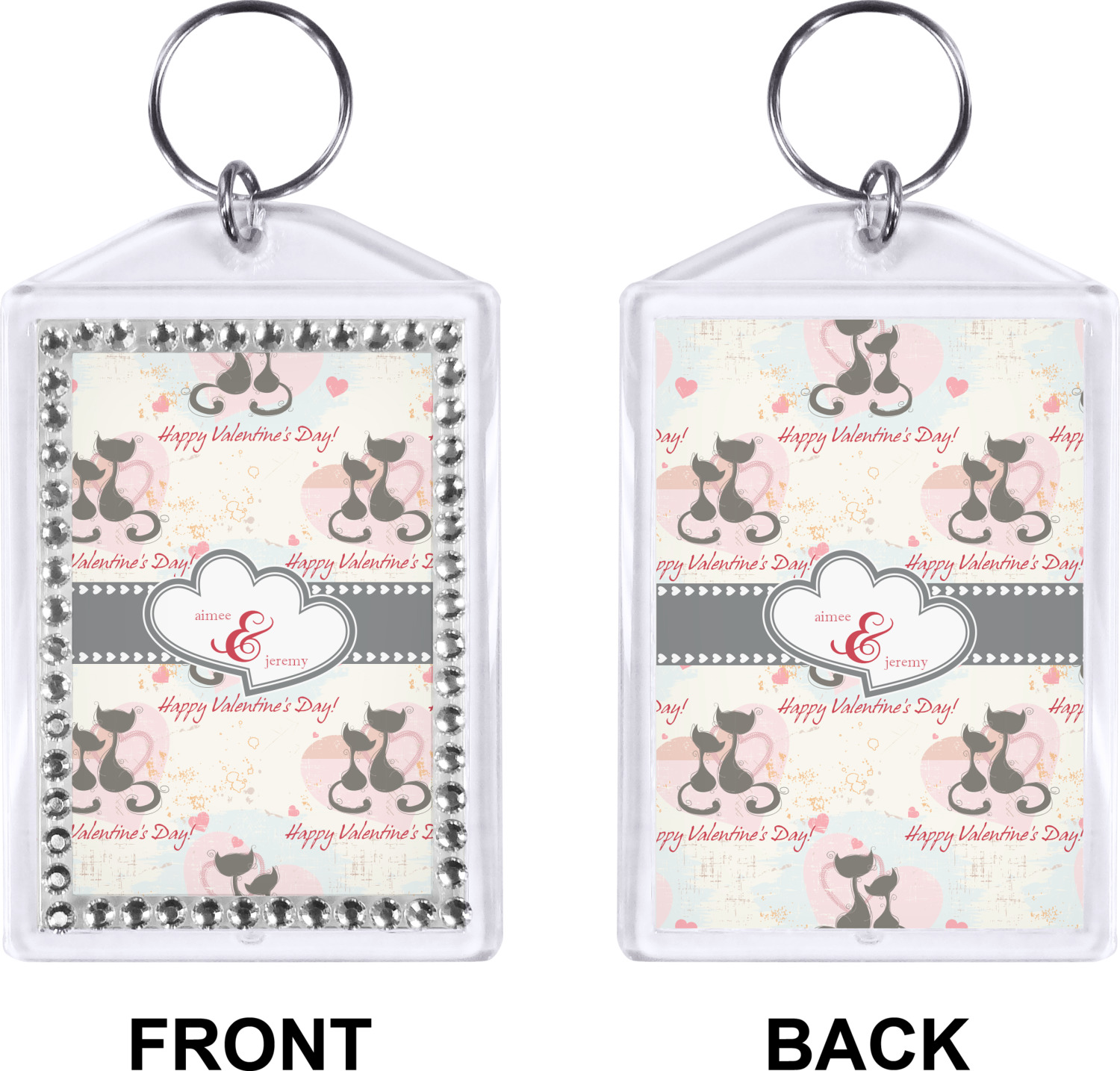 Our personalized keychains have a bold, rectangular shape, outlined by a series of shimmering rhinestones. A metal, split keyring is included with your purchase, and an additional metal hoop allows for attachment of the keychain to the split ring. This unique keychain measures at about 3.75 by 2.5 inches. We print your customized design(s) across both the back and front of this keychain.