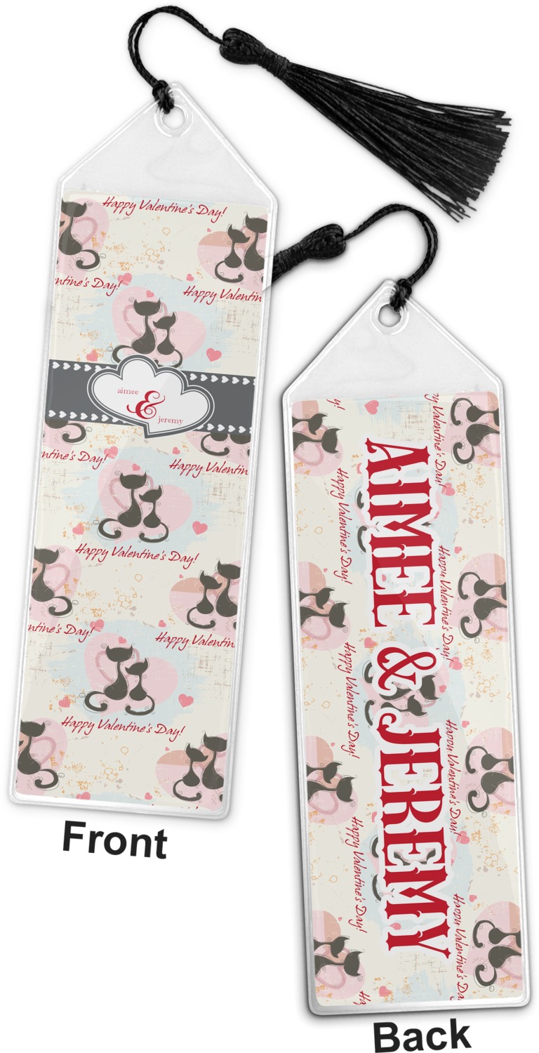 Your personalized bookmark is made of a sturdy, clear vinyl, and is approximately 7.5" x 2.25". We display your personalization on vinyl inserts that are placed on both sides. Accompanying each book marker is a black, fringe tassel that attaches to the reinforced, triangular header.