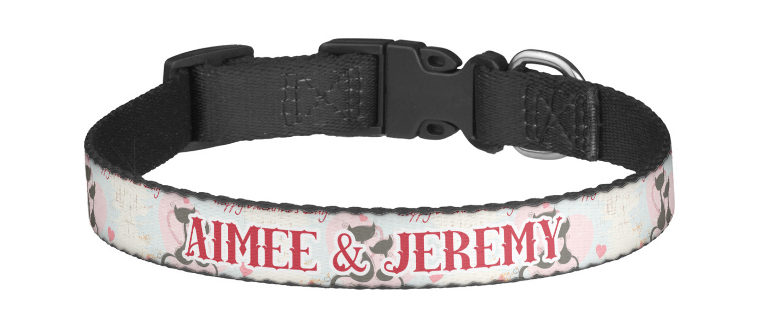 This sturdy collar, made from a durable nylon weave, will outlive your dog's episodes of excited tugging and pulling. Courtesy of its thick plastic buckle and adjuster, this collar is adjustable and accommodating of any dog. Structurally, the collar is a single piece of nylon weave that is sewn together, and features a solid metal loop where you can attach a leash or dog tag. We print and display your dog's name and pattern across the middle of the personalized dog collar.