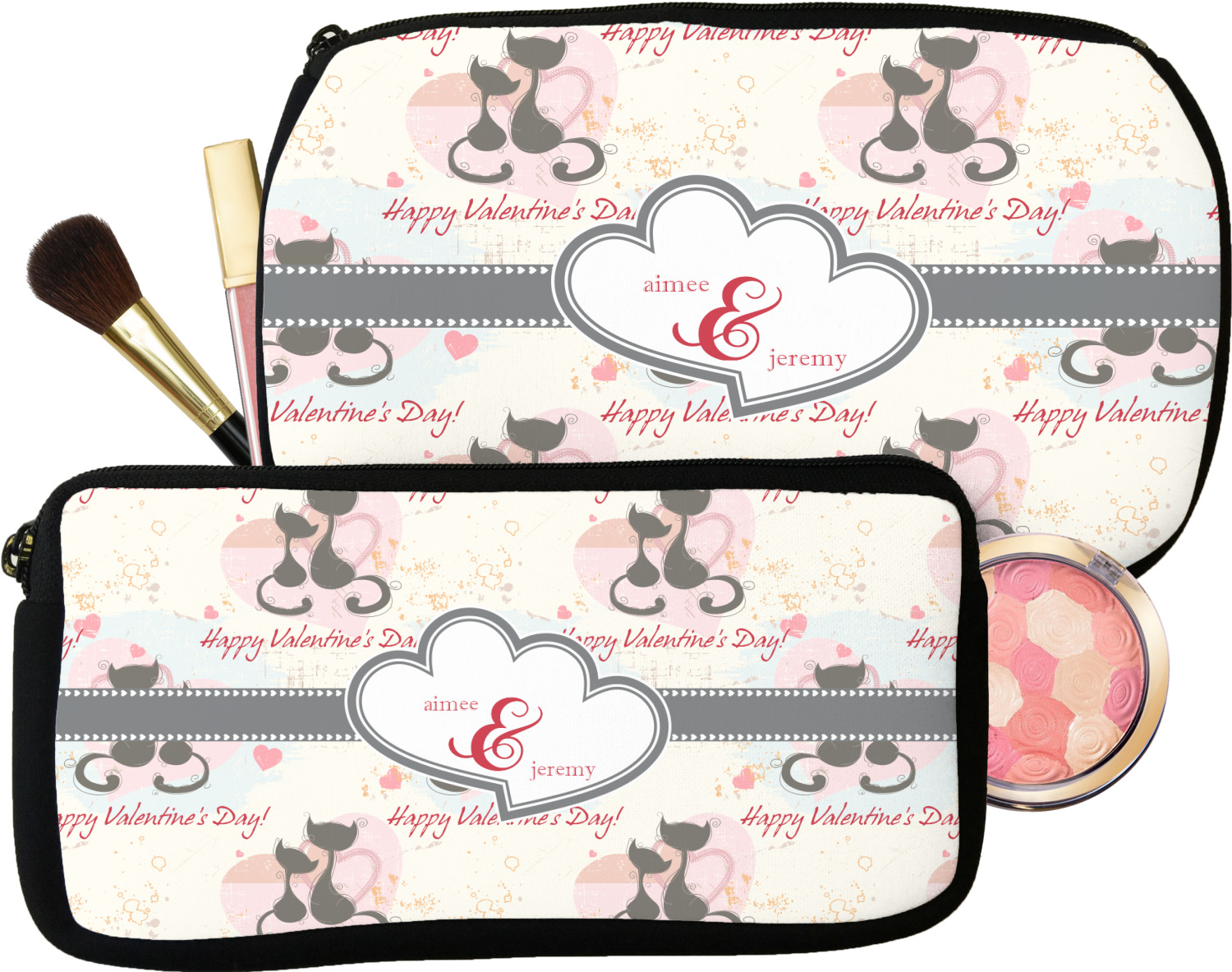 Our personalized makeup bags are available in many different designs, patterns and colors - so you are sure to find one that will love. They are made of neoprene (same material as wet-suits) and thus are water resistant, so spillages in your makeup bag will not end up all over you purse. They are customized on one side and are black on the other side and the zipper is black as well.