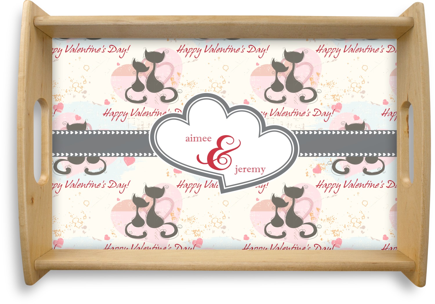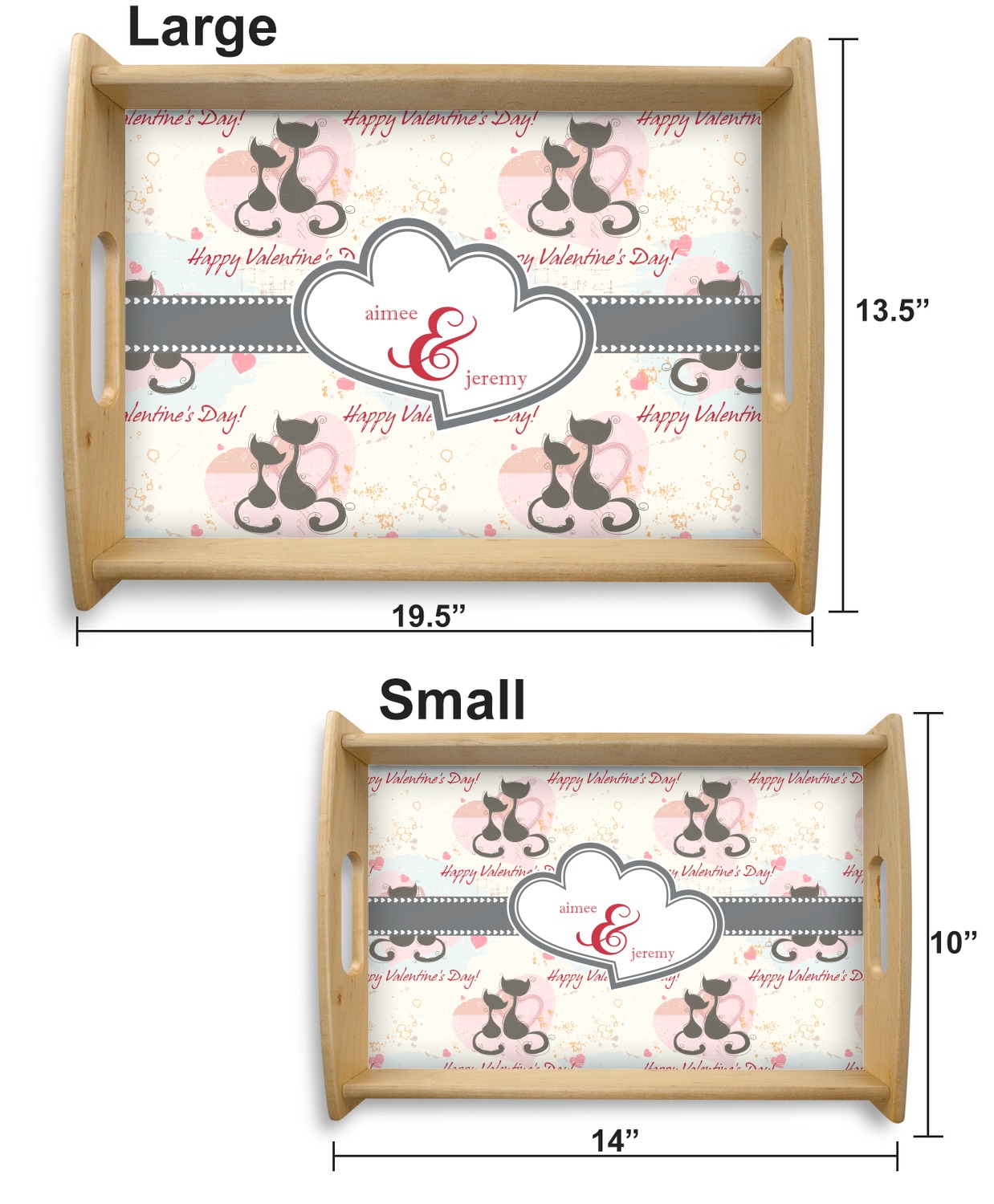 This serving tray with handles features square edges and two rounded sides, creating a very modern look. Each side is fabricated from a beautifully cut, natural wood. The bottom of the interior of the tray displays your customized design in bright, vibrant color. The tray is sold in both a black color and a natural wood look. Each variation of the wood serving tray has two sizes: Small, which is 14" x 10" x 2.25", and Large, which is 19.5" x 13.5" x 2.75".