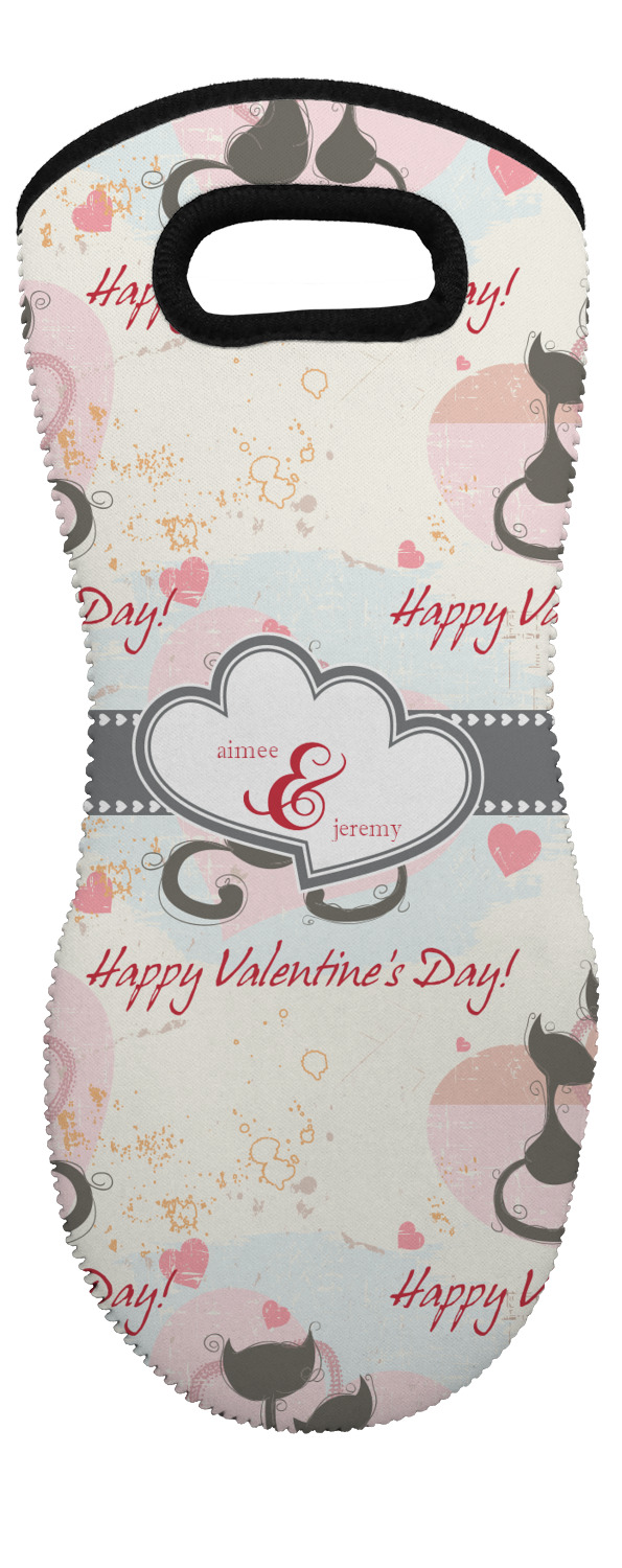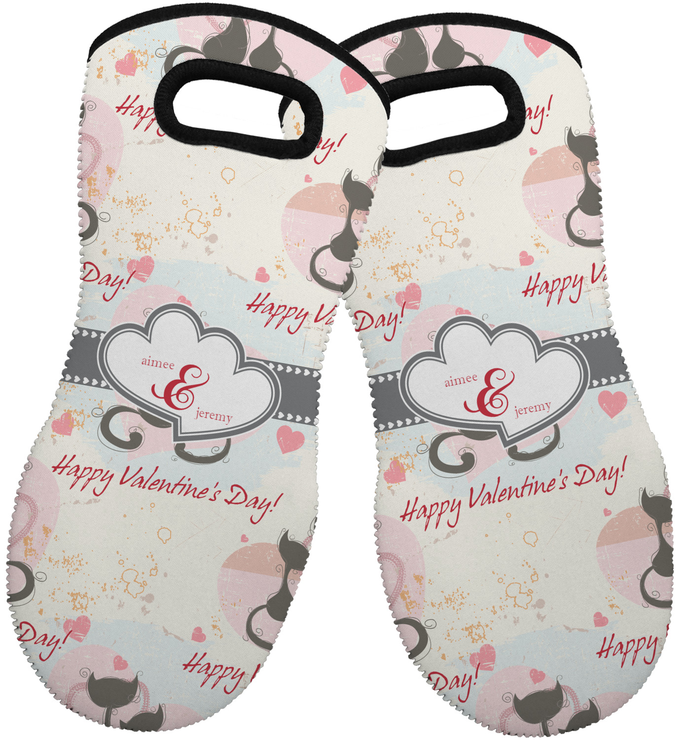 These heat resistant gloves are made entirely of a durable neoprene; the front features a softer texture, while the palm's side has a textured surface, meant to handle heat up to 500 degrees Fahrenheit. Thick, heavy duty stitching connects the two sides. A small, oval cutout appears on the front, and can be used to hang and store the mitt. Your personalization appears on the front, and the upper part of the back of the mitt. The style of these oven mitts are suitable for both the right and left hand, depending on your needs. If you need one for each hand, be sure to order two!