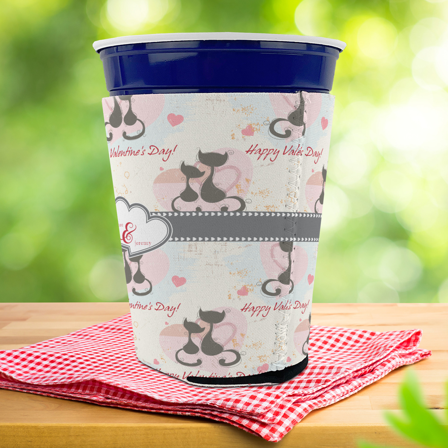 Made from neoprene with a polyester outer fabric and sewn seams, these premium quality party cup sleeves are very durable and will hold up to heavy use. They are available in 2 styles - with a bottom or just a sleeve to go around the outside of the tapered cup. The sleeve covers are about 4" tall and cover about 90% of the classic 16 oz. Solo cup.