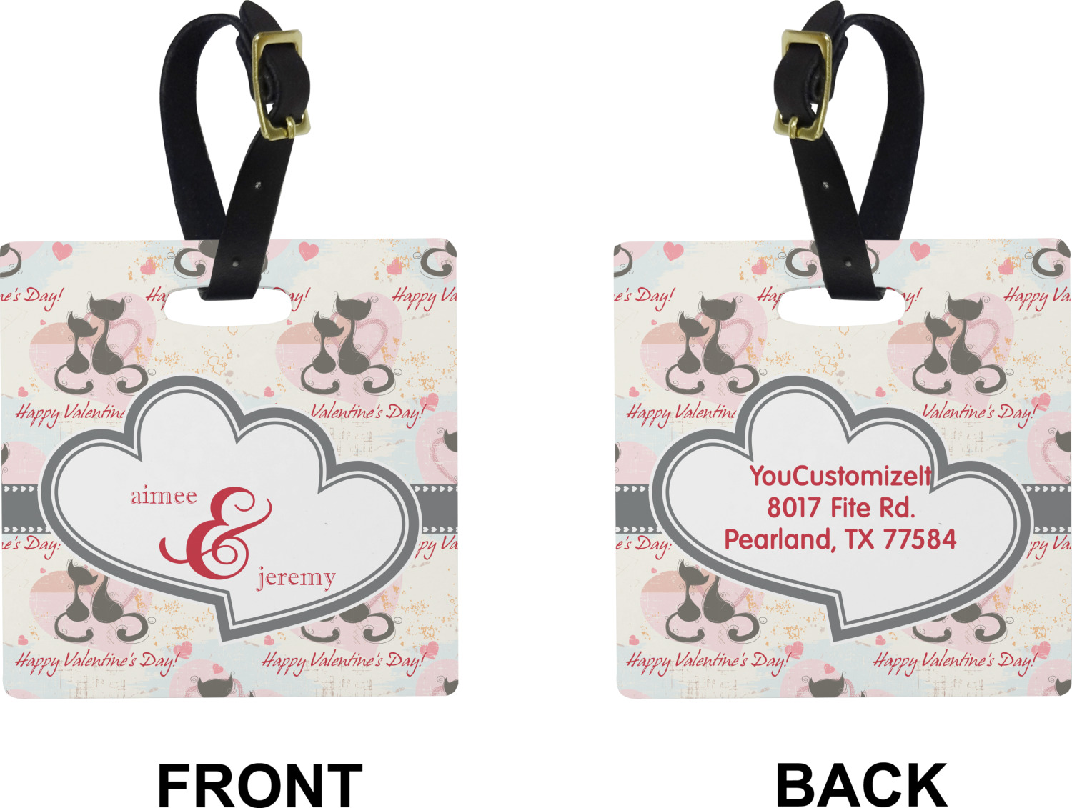 These personalized bag tags are sold in a variety of shapes, so that you may find the product that meets your vision exactly. We sell a round luggage tag, which measures at approximately 4" x 4". Our square luggage tag is about 3.5" x 3.5", while our rectangular version is 2.75" x 4 ".