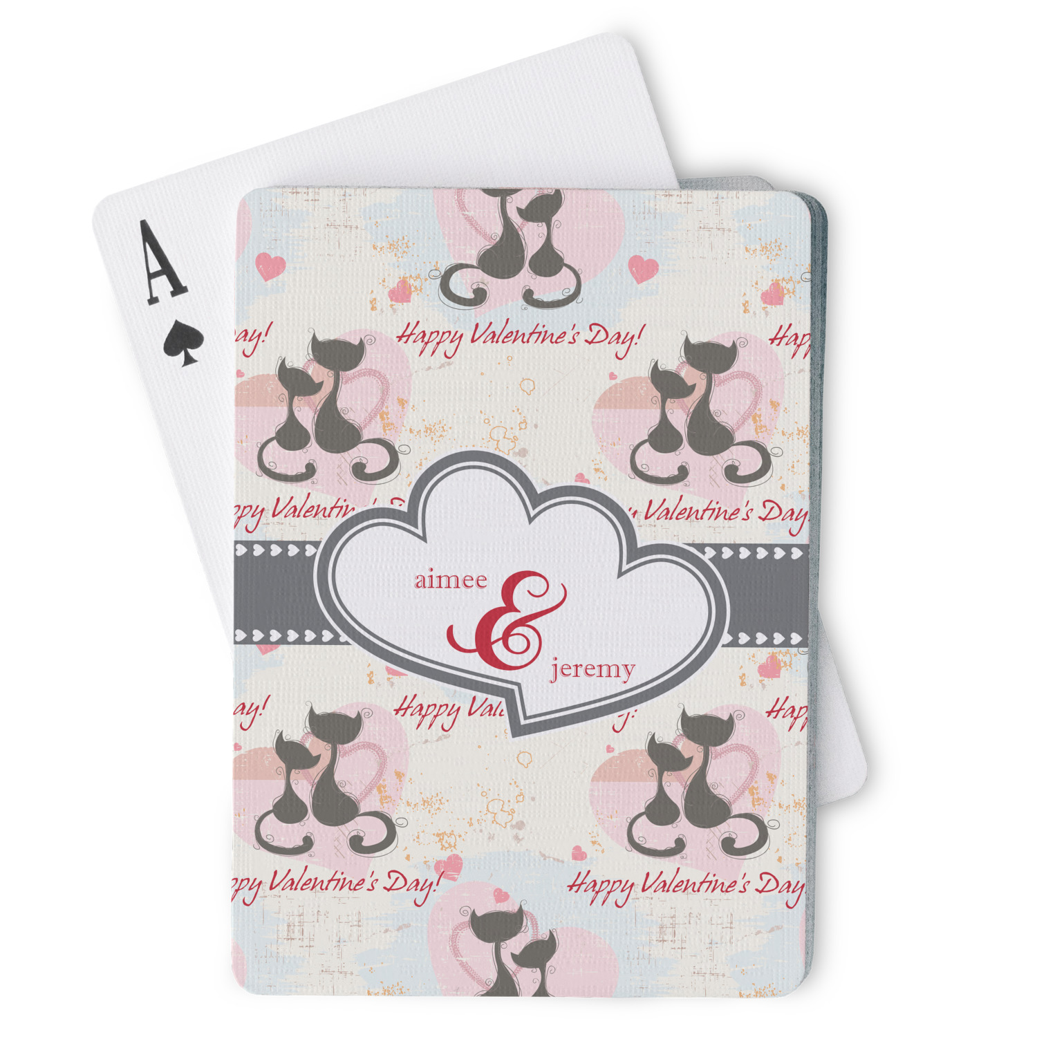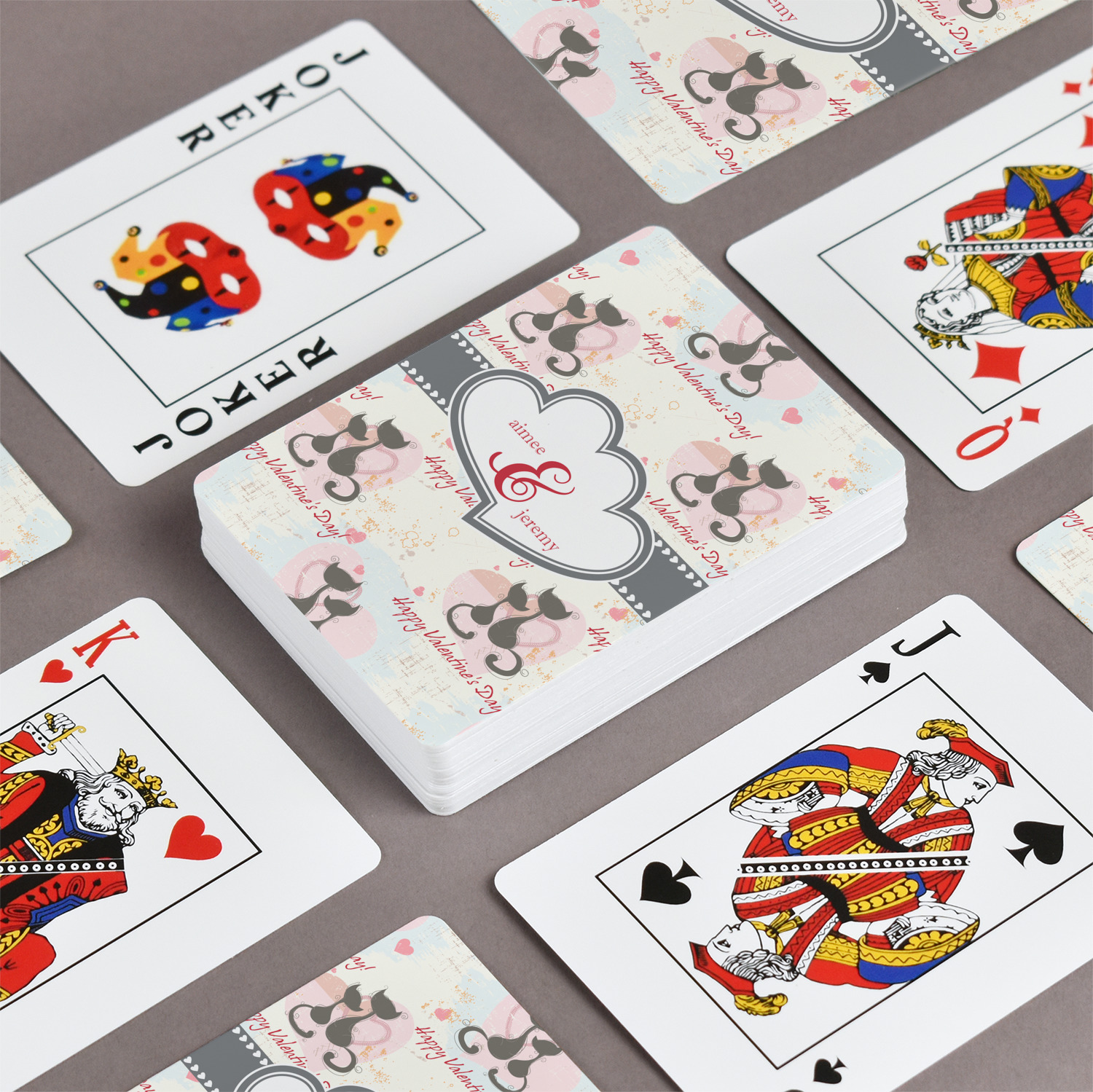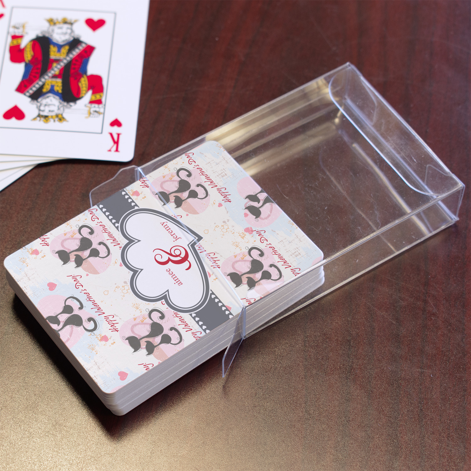 The customization / personalization is printed on the back side. The playing cards have a low gloss coating on both sides. The cards are packaged in a clear plastic box.