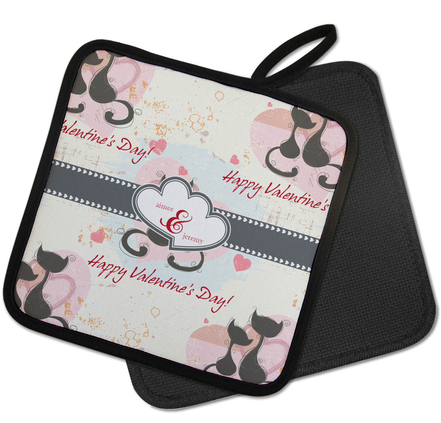 Our personalized pot holders feature a neoprene front that displays your personalization in vibrant colors. The backing of the hot pot holder is rubberized; the textured backing allows you to have a great grip when using this custom pot holder. The two materials are joined with a sleek, black trim, and the holder also includes an attached loop for hanging and storage. The pot holder is approximately 8.75 inches by 8.75 inches and 0.25 inches tall, while the fabric loop is 2.5 inches long. You can purchase a kitchen pot holder by itself or as a set of 2. We also offer a set including one pot holder and one oven mitt.