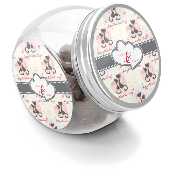 This treat jar is an excellent way to store treats for your favorite canine or feline. Moreover, their delicate, classy appearance makes them a tasteful addition to your countertop's décor. Crafted from clear glass, its unique construction and silver metal, screw-on lid allows for quick and easy access. Three, permanent, vinyl stickers are applied to both sides of the jar and lid, presenting your personalized design. The base of this glass, dog treat jar is 3.4" x 4.75", and the jar stands at 5" tall. Though on the smaller side, this jar is best suited for smaller treats or training treats.