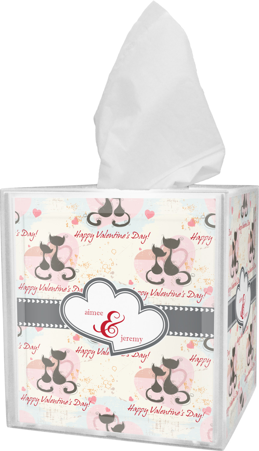 These tissue holders are built from durable acrylic and display your unique personalization on fine-quality vinyl inserts placed within the four sides and top. The box features two pieces, allowing you to easily switch out tissue boxes. On the sides, youll find ridges that ensure the top and base fit securely in place. The bottom of these tissue box holders has four, rubber, non-slip pads to prevent the box from scuffing any surface you decide to display it on. Each box can fit a standard 5 by 5-inch box of tissues.