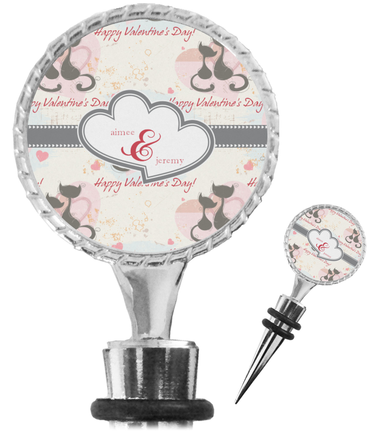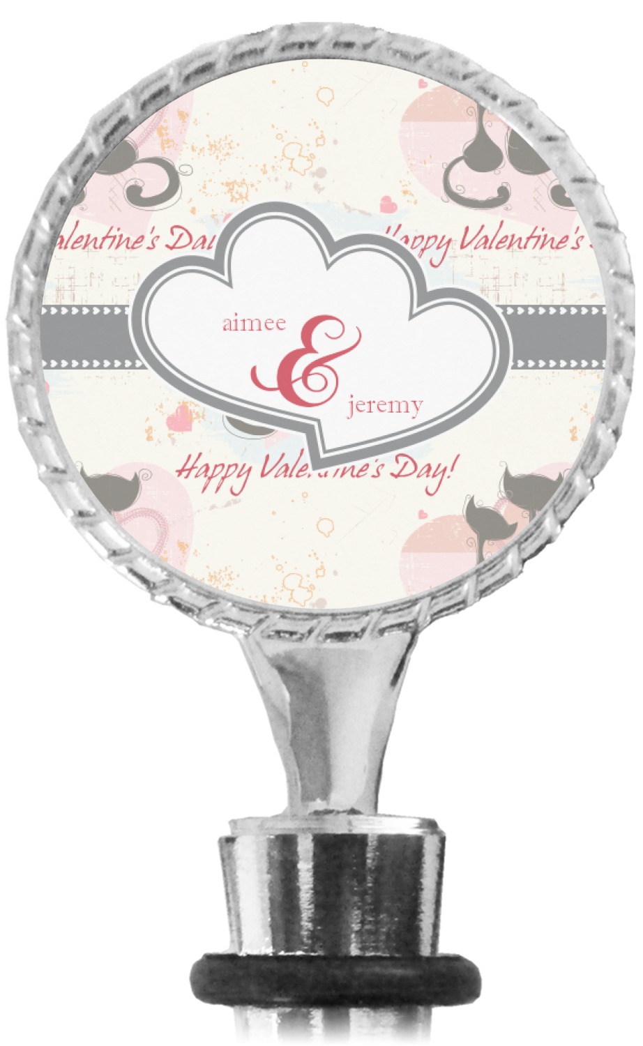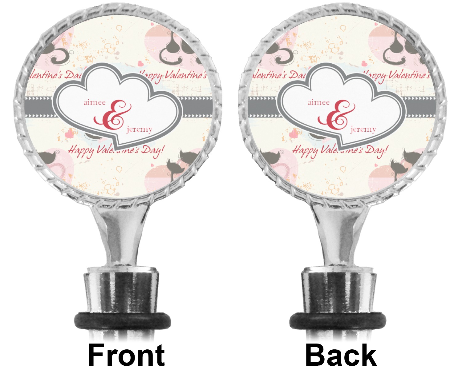 The top part of your bottle stopper is comprised of a zinc ring that displays your customization(s) in its middle, on both sides. The ring is heavy duty, with a bright chrome finish. The body of the wine stoppers have two silicone rings to provide an airtight seal. These wine bottle stoppers measure at 1.625" L x 0.8125" W x 4.625" H; your custom wine stopper is meant to fit into most standard-sized wine bottles.