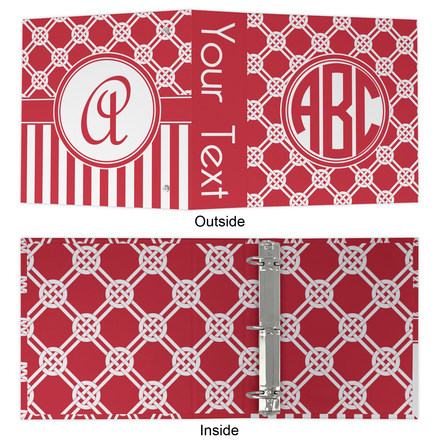 Made from a sturdy cardboard base with a full high quality canvas textured vinyl wrap with the design of your choice. Unlike our standard 3-ring binder with the full wrap design your artwork wraps from the front and back and into the inside of the binder.