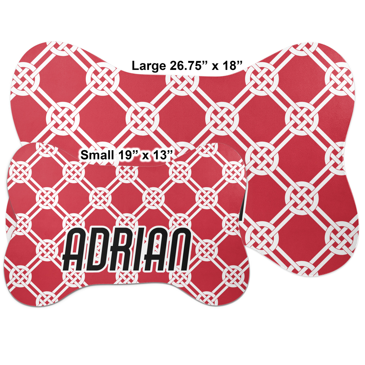 The top of this mat displays your custom design, as it is printed on polyester. To prevent slippage, the underside of the mat is made of rubber. We offer a small dog food mat, suitable for smaller dogs and a large dog food mat for bigger breeds. The small dog food mat is approximately 19 by 13 inches, while the large dog feeding mat measures at approximately 26.75 by 18 inches. Both personalized mats are ideally sized to fit two dog bowls.