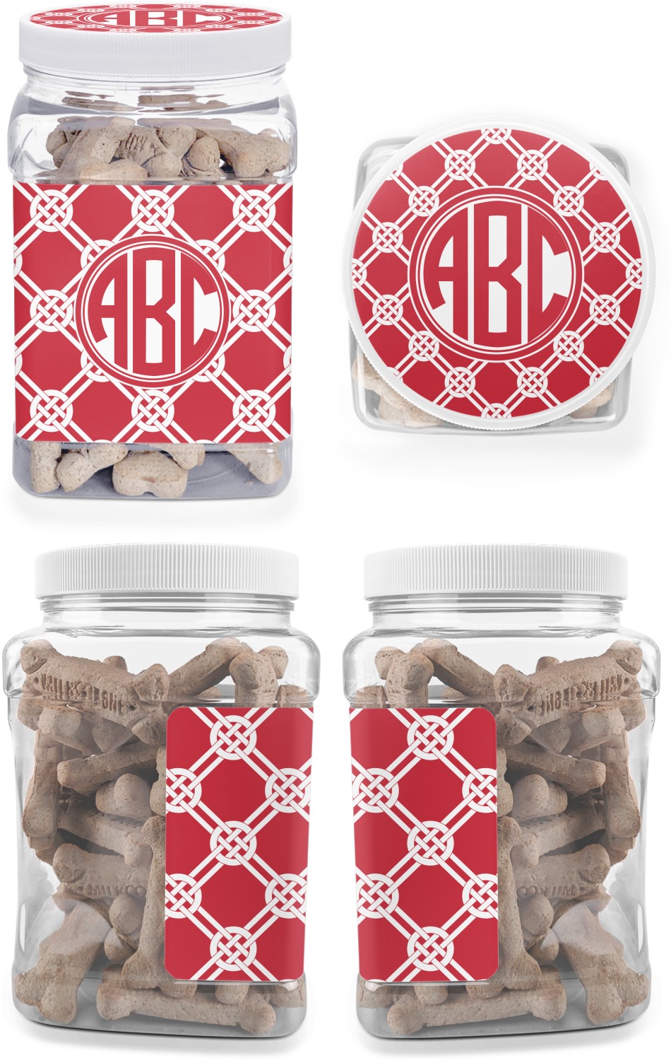 This half gallon jar, made from a sturdy plastic, is the perfect way to keep treats from any naughty pet paws, while still keeping them ready on hand for when your pup performs an impressive trick. This dog cookie jar features a screw-on, white lid that displays your personalized design on a vinyl sticker. We apply another customized sticker that wraps around the front and sides of the jar. Our dog treat jar also has indentations on the rear ends of the sides, which allows for convenient handling, and its square frame allows for easy storage.