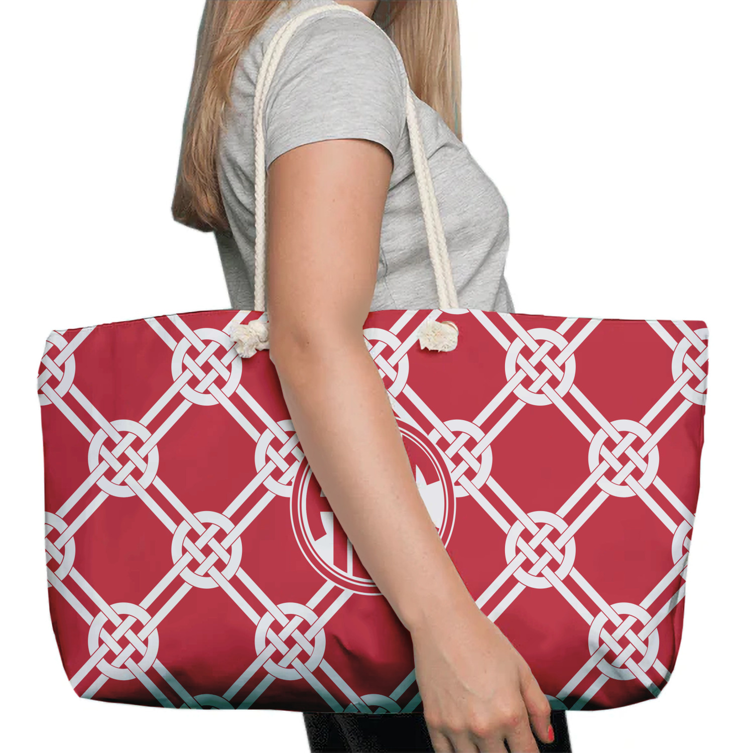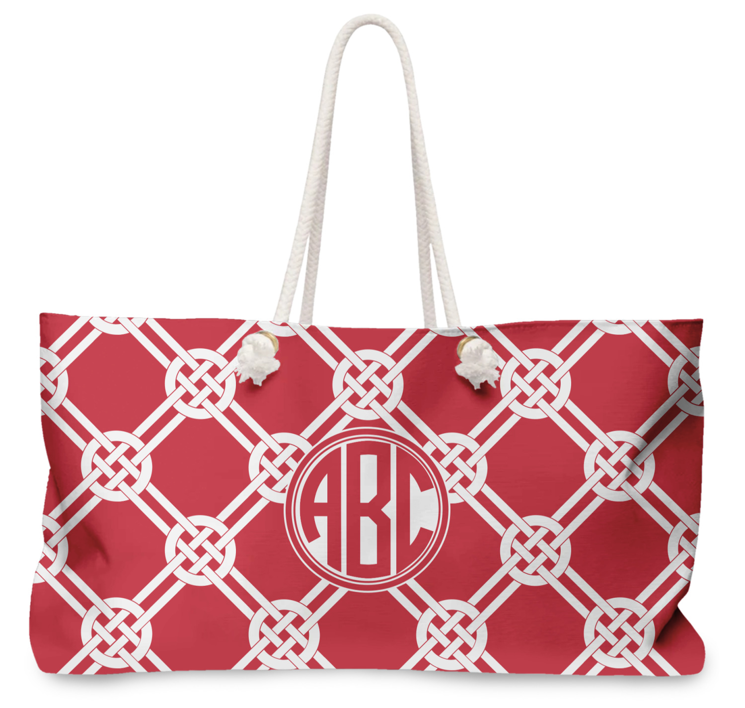 Our oversized weekender tote with rope handles is perfect for your weekend at the beach or on the town. This large tote are 24" W X 13" H, with a 5" gusset and a 27" thick rope handles with a knot that is put through a grommeted brass hole.