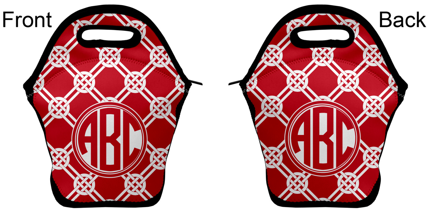 Our personalized lunch bags are made from a strong neoprene, and secure with a zipper closure that lines the top of the bag.The edges of the neoprene are sewn together with a heavy duty stitch, adding to the durability of the bag. The is accompanied by a reinforced handle at its top, for the easy transport of your lunch. We display your personalization across both the front and back of this neoprene lunch bag, while the remaining sides are a sleek black in color. Each bag measures at 13.5 inches tall, and 11.5 inches wide.