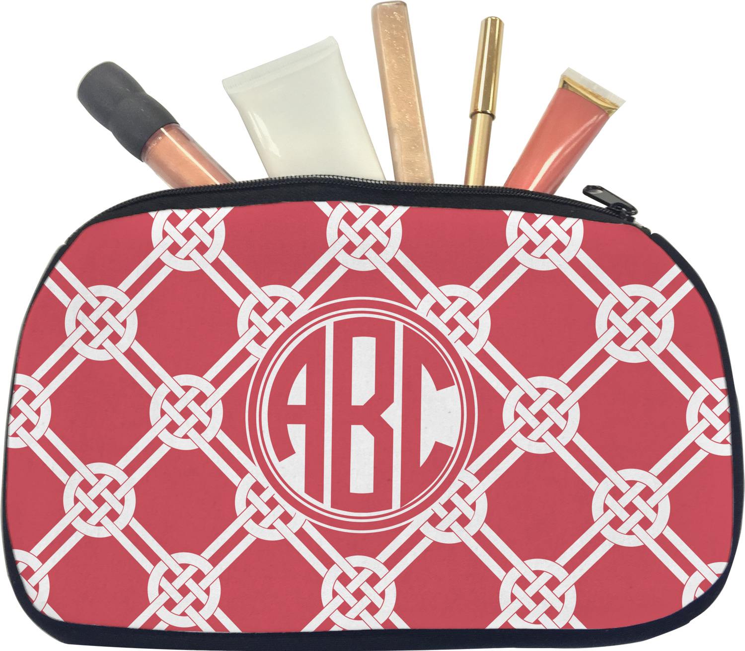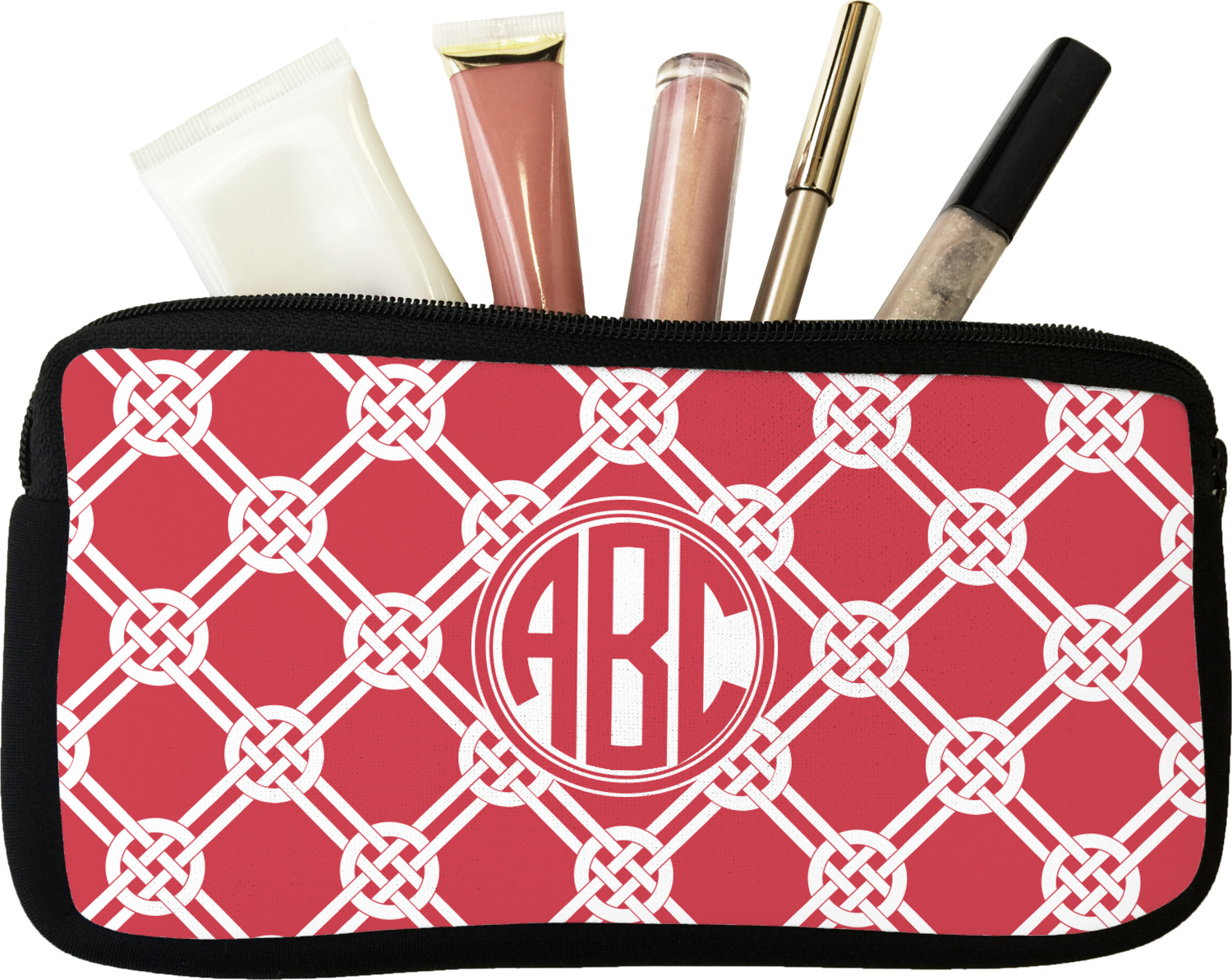 Our personalized makeup bags are available in many different designs, patterns and colors - so you are sure to find one that will love. They are made of neoprene (same material as wet-suits) and thus are water resistant, so spillages in your makeup bag will not end up all over you purse. They are customized on one side and are black on the other side and the zipper is black as well.