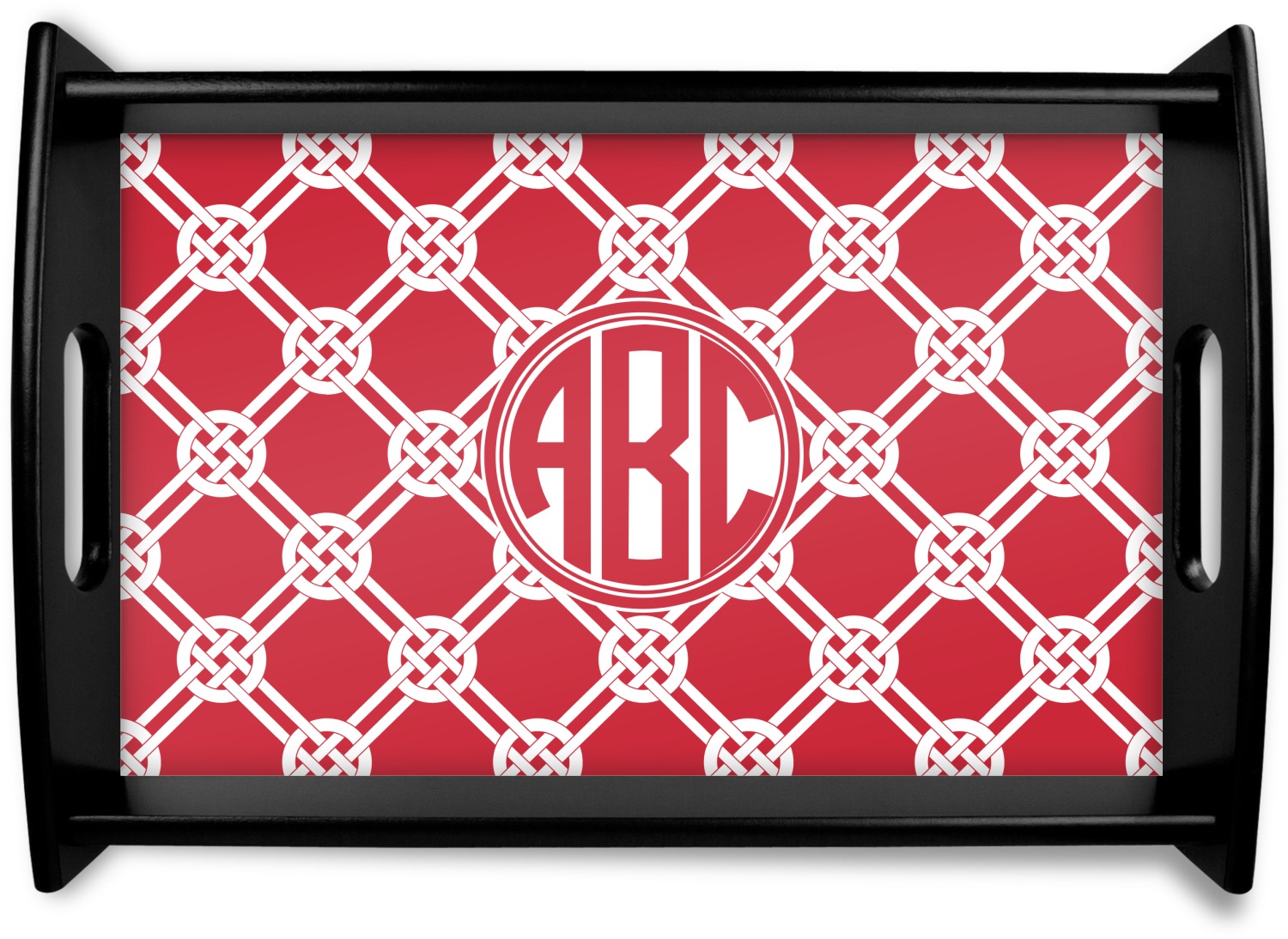 This serving tray with handles features square edges and two rounded sides, creating a very modern look. Each side is fabricated from a beautifully cut, natural wood. The bottom of the interior of the tray displays your customized design in bright, vibrant color. The tray is sold in both a black color and a natural wood look. Each variation of the wood serving tray has two sizes: Small, which is 14" x 10" x 2.25", and Large, which is 19.5" x 13.5" x 2.75".