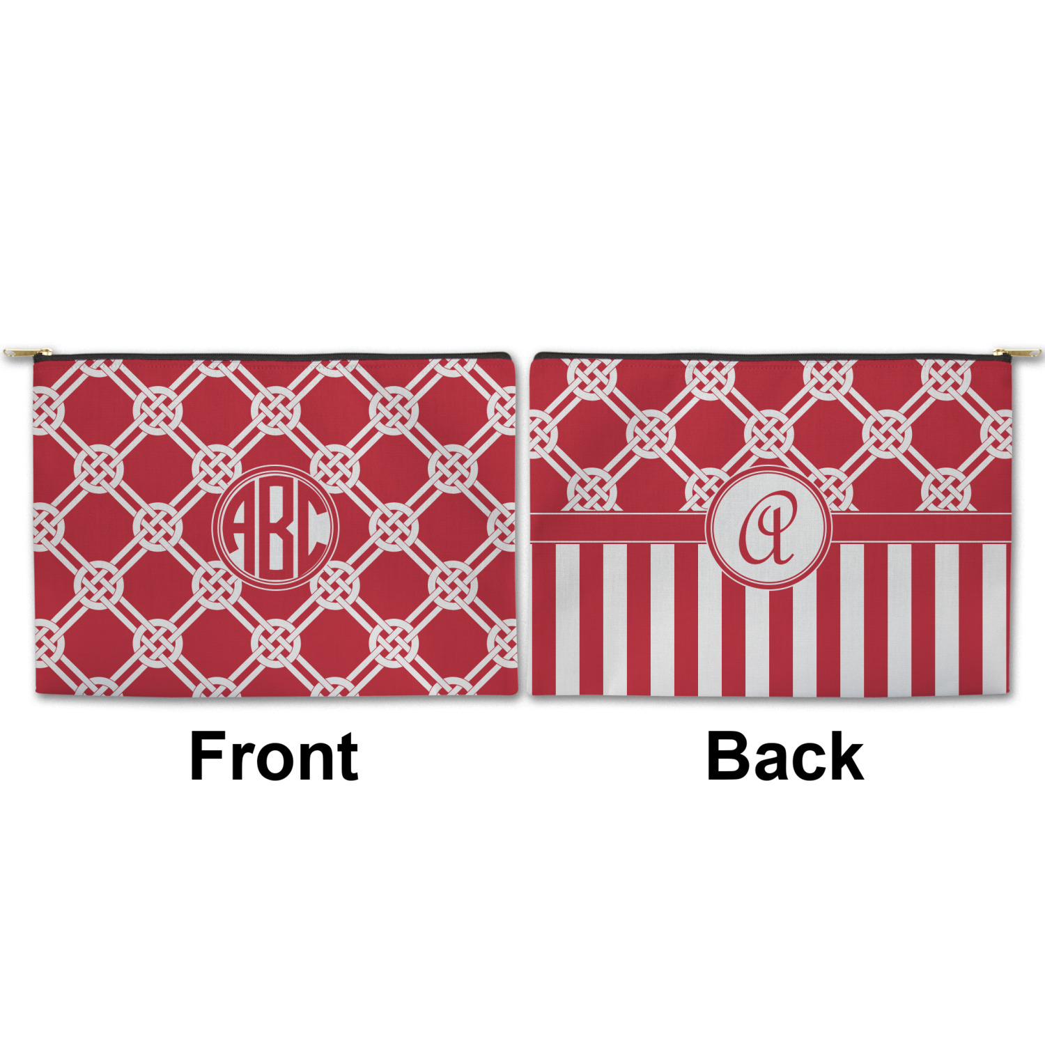 You can design both the front and the back of the pouch - same design, two complementary designs or two totally different designs - the choice is yours! We offer many different personalization styles i.e. name, name & initial, monograms - so the choice to personalize is also yours.