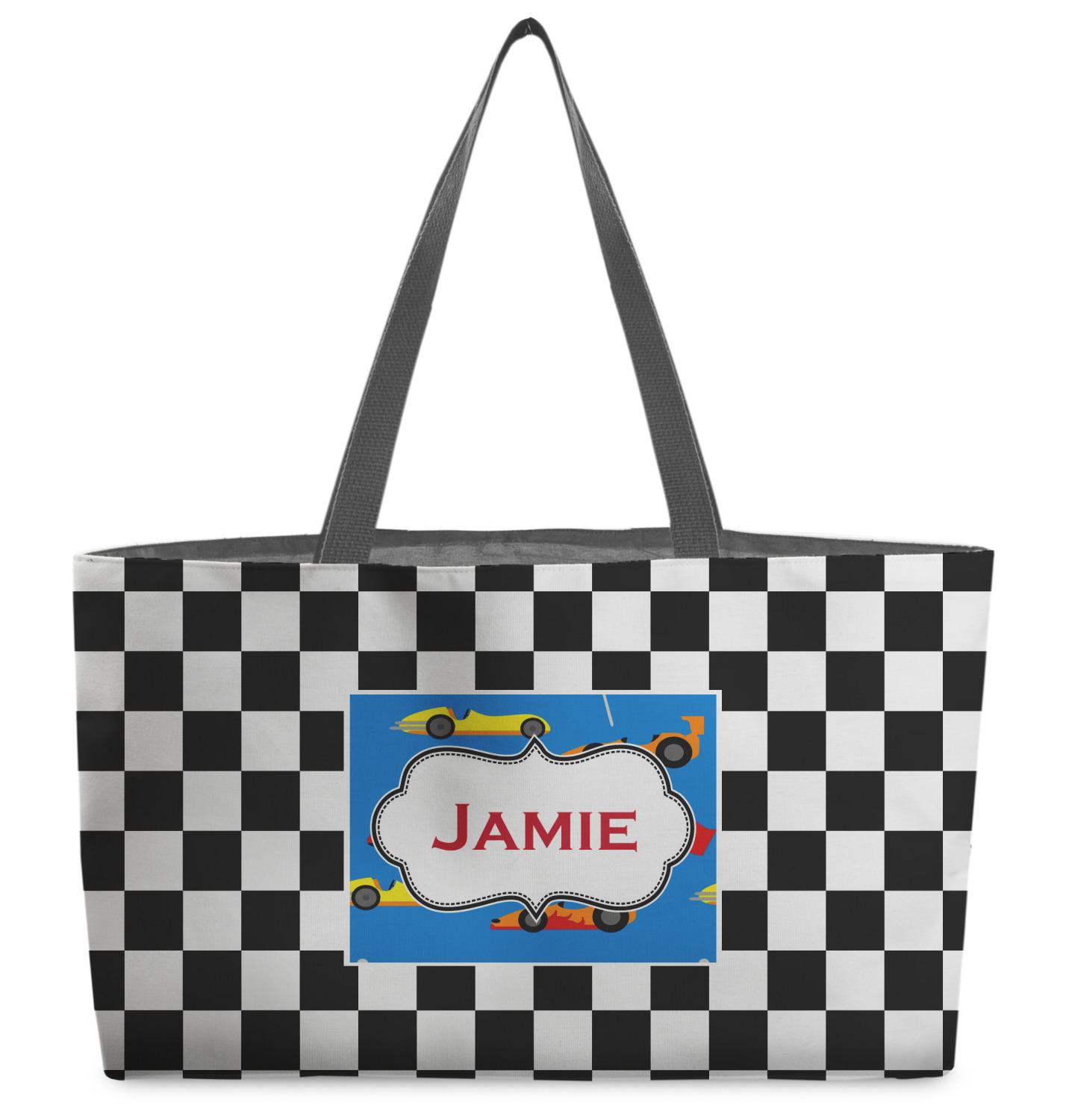 These beach totes are handmade here in the USA. Fabric is printed with your design. The tote is then sewn from the fabric pieces, lining and handles added.