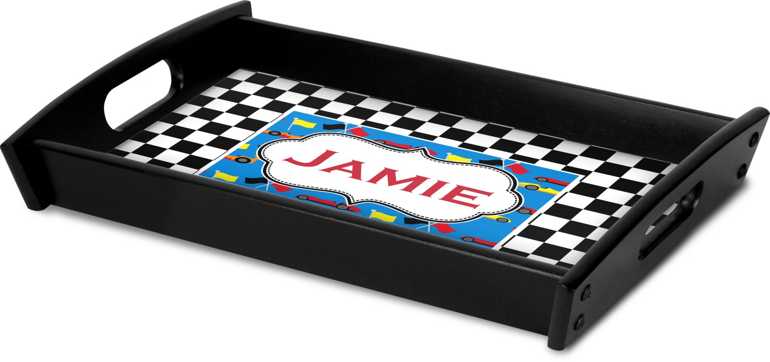 This serving tray with handles features square edges and two rounded sides, creating a very modern look. Each side is fabricated from a beautifully cut, natural wood. The bottom of the interior of the tray displays your customized design in bright, vibrant color. The tray is sold in both a black color and a natural wood look. Each variation of the wood serving tray has two sizes: Small, which is 14" x 10" x 2.25", and Large, which is 19.5" x 13.5" x 2.75".